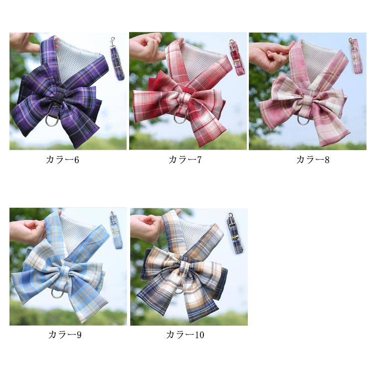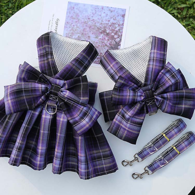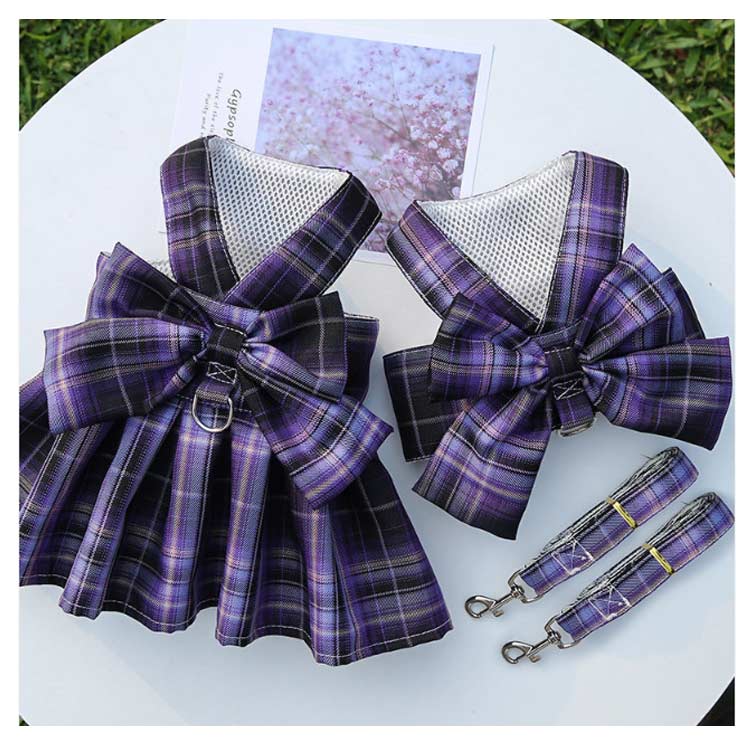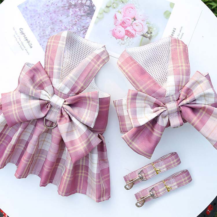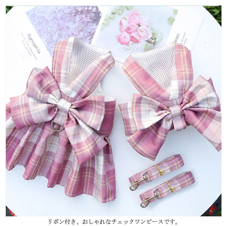 おしゃれなjk制服風ハーネスとリードセット!ハーネス リード セット チェック柄 ワンピース 犬 ハーネスリード 小型犬 中型犬 ウェアハーネス 胸背 ペットウェア 犬用 介護用 首輪 かわいい 胴輪
