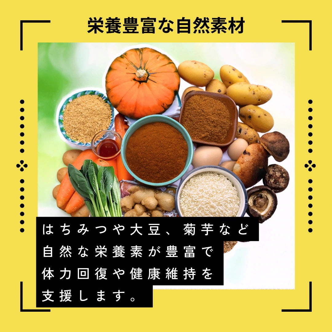 馬肉、米粉、大豆、野菜類(じゃがいも・かぼちゃ・にんじん・キャベツ・小松菜・サツマイモ・ピーツアーツ・菊芋)、おから、米ぬか、有機黒糖、鰯粉、宗田節粉、エゴマ粉、ファイバーガム、高野豆腐、卵殻カルシウム、干椎茸、コラーゲン粉末、蜂蜜、昆布、乳酸菌
