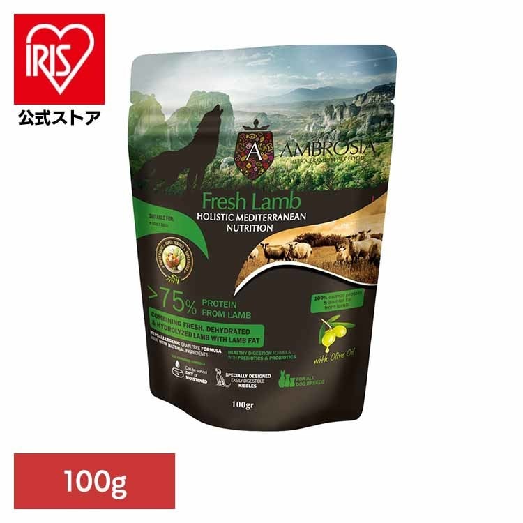 ラム肉(30%)、ドライラムタンパク(22%)、サツマイモ、エンドウ豆、ラムの脂肪(5%)、加水分解されたラムタンパク(3%)、ドライルツェルン、ビートパルプ、ドライチコリ(イヌリンとフルクトオリゴ糖の供給源として;1%)、オリーブオイル(0.5%)、亜麻仁、塩化コリン、マンナンオリゴ糖(0.15%)、タウリン、ドライアップル、ドライトマト、フェヌグリーク、ドライ梨、ドライオレンジ、オレガノ、タイム、プロバイオティクス(エンテロコッカス・フェシウム)、ビタミンE(一部保存料として)、ビタミンC、亜鉛、鉄、マンガン、ビタミンB12、ビオチン、ナイアシン、パントテン酸、ビタミンA、ビタミンB2、銅、ビタミンB1、ビタミンB6、ヨウ素、葉酸、セレン、ビタミンD3