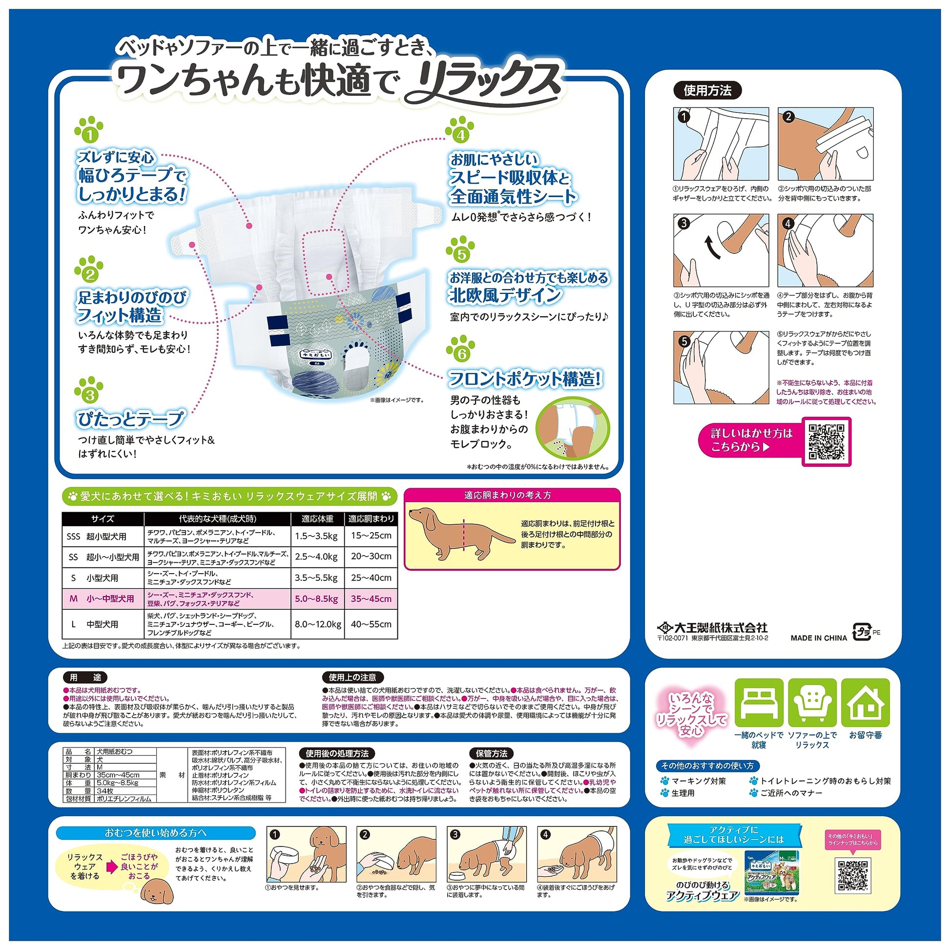 商品紹介室内向けテープタイプの犬用紙おむつ。ベッドやソファーの上で一緒に過ごすとき、ワンちゃんも快適でリラックス。●ずれずに安心、幅ひろテープでしっかりとまる。ウエスト部のテープの幅が広く、面でフィットして力が分散しゆったり装着できてワンちゃんにやさしい。●ムレ0発想でさらさら感がつづいてお肌にやさしい。スピード吸収体と全面通気性シートでムレにくい。おしっこした厚に急激に高まる湿度を素早く外に逃がすことでムレの原因を減らします。●男の子も女の子も安心のフロントポケット構造。男の子の性器もしっかりおさまる。お腹まわりからのモレをブロック。男の子、女の子共用。【使用シーン】・一緒のベッドでの就寝・お留守番・ソファーの上でリラックス使用方法①リラックスウェアをひろげ、内側のギャザーをしっかりと立ててください。②シッポ穴用の切込みのついた部分を背中側にもっていきます。③シッポ穴用の切込みにシッポを通し、U字型の切込み部分は必ず外側に出してください。④テープ部分をはずし、お腹から背中側にまわして、目印デザインを目安にテープをつけます。⑤リラックスウェアがからだにやさしくフィットするようにテープ位置を調整します。テープは何度でもつけ直しができます。※うんちをした場合は不衛生にならないように取り除き、お住まいの地域のルールに従って処理してください。