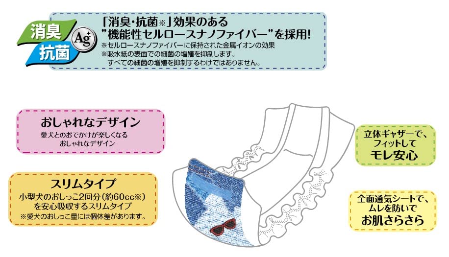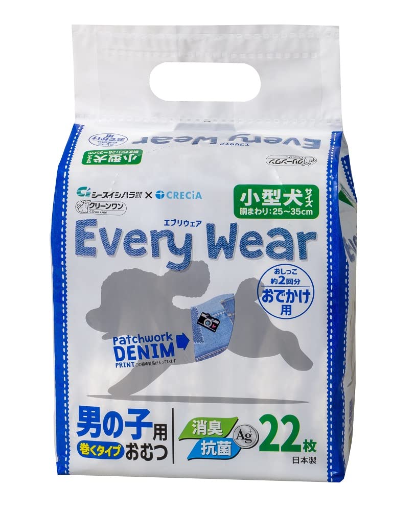 商品紹介・「エブリウェア」は、日本製紙クレシア株式会社シーズイシハラ株式会社が共同開発した製品です。・"機能性セルロースナノファイバー”に保持された金属イオンで、「消臭・抗菌※」!わんちゃんも飼い主様も、ずっと快適♪・着用するわんちゃんのことを考えた安心設計・肌に接する面はやわらか素材を採用・通気性フィルム採用でムレを防ぎます。・使用シーンで選べる2種類、スッキリタイプの「おでかけ用」と、安心吸収の「おるすばん用」をご用意しました。・おでかけの時もおるすばんの時も、いつも楽しく過ごせる、おしゃれなデザインにしました。・本製品を袋から取り出すときは、製品を傷つけないようにご注意ください。*取り出す時に製品同士がくっついて出てくる場合がありますが、品質には問題ありませんので、安心してご使用いただけます。・本製品は使い捨ての紙おむつですので、洗濯はしないでください。・本製品をハサミ等で切らないで、そのままご使用ください。中身のこぼれや尿漏れの原因となります。・本製品を持ち運ぶ際は、革製品等と密着した状態や高温多湿になる状況を避けてください。また、アルコール等がかからないようにご注意ください。色移りの原因となります。・テープは直接、皮膚や被毛に付けないでください。・本製品は食べられません。ペットが嚙んだり食べたりしないようにご注意ください。・本製品を誤って人やペットが飲み込んだり、中身が目に入った場合には医師や獣医にご相談ください。・本製品の仕様は予告なく変更する場合があります。使用方法①白い吸収体面を上にして、愛犬の局部をやさしく包み込むように、お腹の下側にもってきます。※本製品に前後はありませんので、どちらからでもご使用いただけます。②片手で愛犬と製品をしっかりおさえながら、体にフィットするように、巻き上げてください。※必ず局部がギャザーの内側におさまっていることを確認してください。③しっかり巻き上げながら、青いテープをしっかりととめてください。テープの位置は、ペットにあわせて調節してください。④外側のギャザーを外に出し、しっかり局部を覆っていることを確認してください。※本製品が汚れた場合は、早めに交換してください。・オス犬のおしっこ専用紙おむつ*用途以外には使用しないでください。