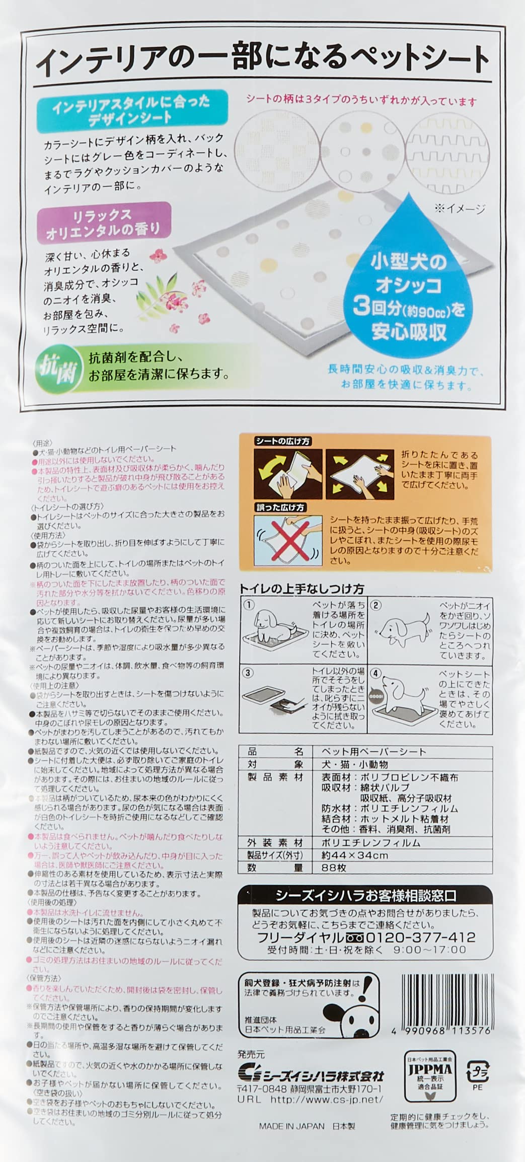 商品紹介1心地よい空間を演出する香り(消臭剤入り)ドライアンバー、サンダルウッド、イランイランの心落ち着く濃厚な香りが空間を包みます。また、アンモニア、トリメチルアミン、硫化水素、メチルメルカプタン等の、悪臭を捕捉して消臭するカキタンニンを配合。カキタンニンより分子量が小さい悪臭のみを消臭するため、香りはそのままに、消臭しながら芳香します。2リビング空間を快適に保つ清潔品質設計 長時間安心の厚型タイプ。オシッコをすばやく吸収し表面さらさら。抗菌剤を配合し、空間を清潔に。使用上の注意●袋からシートを取り出すときは、シートを傷つけないようにご注意ください。●本製品をハサミ等で切らないでそのままご使用ください。中身のこぼれや尿モレの原因となります。●ペットがまわりを汚してしまう場合があるので、汚れてもかまわない場所に敷いてください。●紙製品ですので、火気の近くでは使用しないでください。●シートに付着した大便は、必ず取り除いてご家庭のトイレに始末してください。地域によって処理方法が異なる場合があります。その際には、お住まいの地域のルールに従って処理してください。●本製品は食べられません。ペットが噛んだり食べたりしないよう注意してください。●万一、誤って人やペットが飲み込んだり、中身が目に入った場合は、医師や獣医師にご相談ください。●伸縮性のある素材を使用しているため、表示寸法と実際の寸法とは若干異なる場合があります。●本製品の仕様は、予告なく変更することがあります。●本製品は水洗トイレに流せません。●使用後のシートは汚れた面を内側にして小さく丸めて不衛生にならないように処理してください。また、使用後のシートは近隣の迷惑にならないようニオイ漏れなどにご注意ください。●ゴミの処理方法はお住まいの地域のルールに従ってください。●日の当たる場所や、高温多湿な場所を避けて保管してください。●紙製品ですので、火気の近くや水のかかる場所に保管しないでください。●お子様やペットが届かない場所に保管してください。●開封後は、ほこりや虫が入らないよう封をしっかり閉じて衛生的に保管してください。●空き袋をお子様やペットのおもちゃにしないでください。●空き袋はお住まいの地域のゴミ分別ルールに従って処分してください。原材料・成分製品素材 表面材:ポリプロピレン不織布、吸収材:綿状パルプ、吸水紙、高分子吸収材、防水材:ポリエチレンフィルム、結合材:ホットメルト粘着材 その他:香料、消臭剤、抗菌剤使用方法●袋からシートを取り出し、折り目を伸ばすようにして丁寧に広げてください。シートの広げ方:折りたたんであるシートを床に置き、置いたまま丁寧に両手で広げてください。誤った広げ方:シートを持ったまま振って広げたり、手荒に扱うと、シートの中身(吸収シート)のズレやこぼれ、またシートを使用の際、尿モレの原因となりますので十分ご注意ください。●色のついた面を上にして、トイレの場所の床またはペットのトイレ用トレーに敷いてください。●ペットが使用したら、吸収した尿量やお客様の生活環境に応じて新しいシートにお取り替えください。尿量が多い場合や複数飼育の場合は、トイレの衛生を保つため早めの交換をお勧めします。※ペーパーシートは、季節や湿度により吸水量が多少異なることがあります。※ペットの尿量やニオイは、体調、飲水量、食べ物等の飼育環境により異なります。