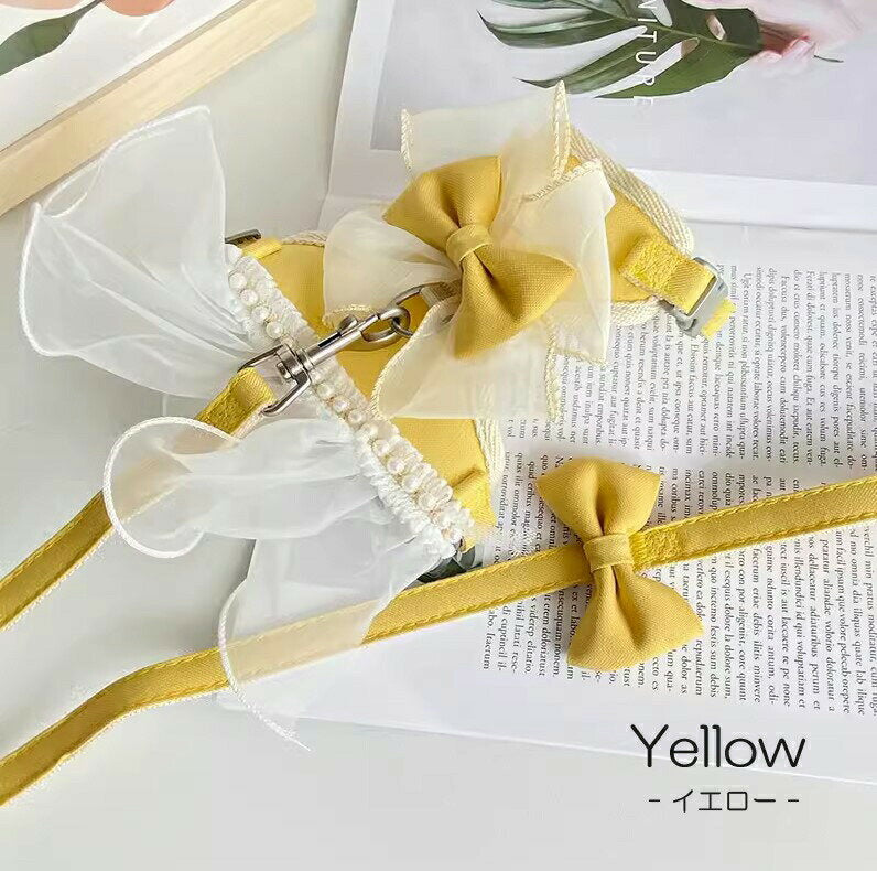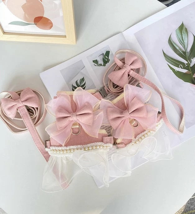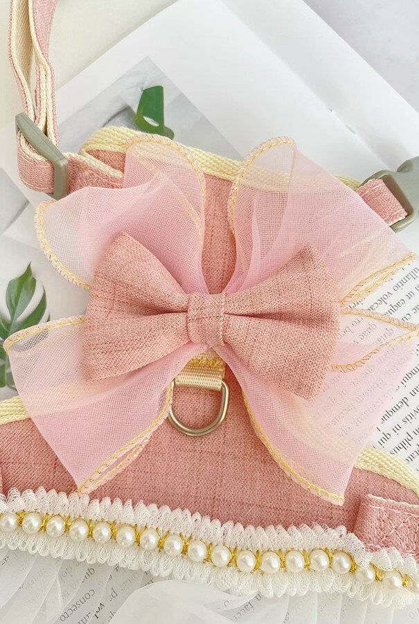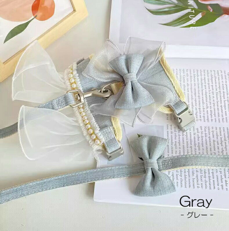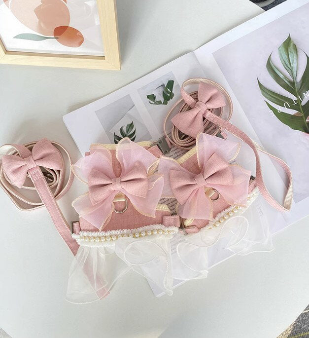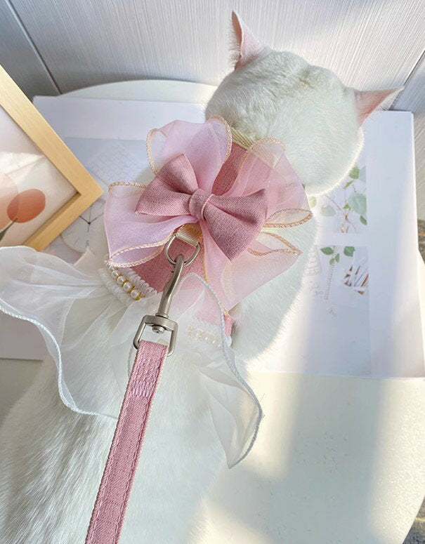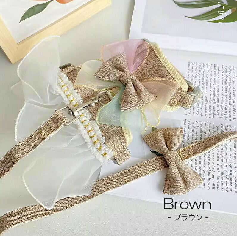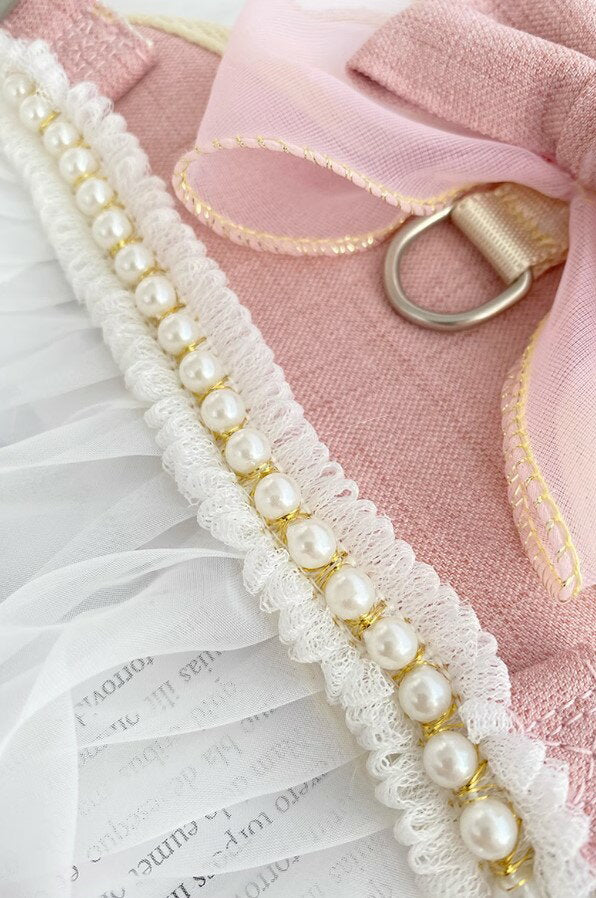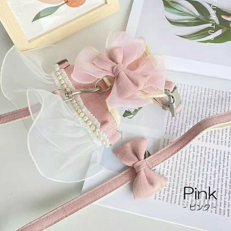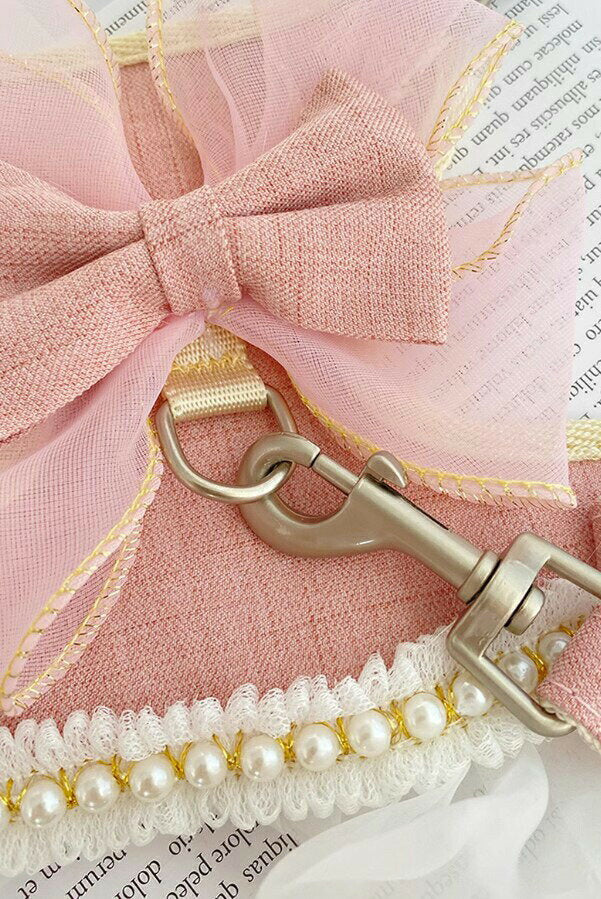 タイムセール 散歩出かけなどに大活躍!猫用 犬用 パールリボン レース パール ハーネス リード付き 可愛い ひらひら オーガンジーレース 切替 蝶結び リボン ワンピース 小型犬散歩出かけなどに