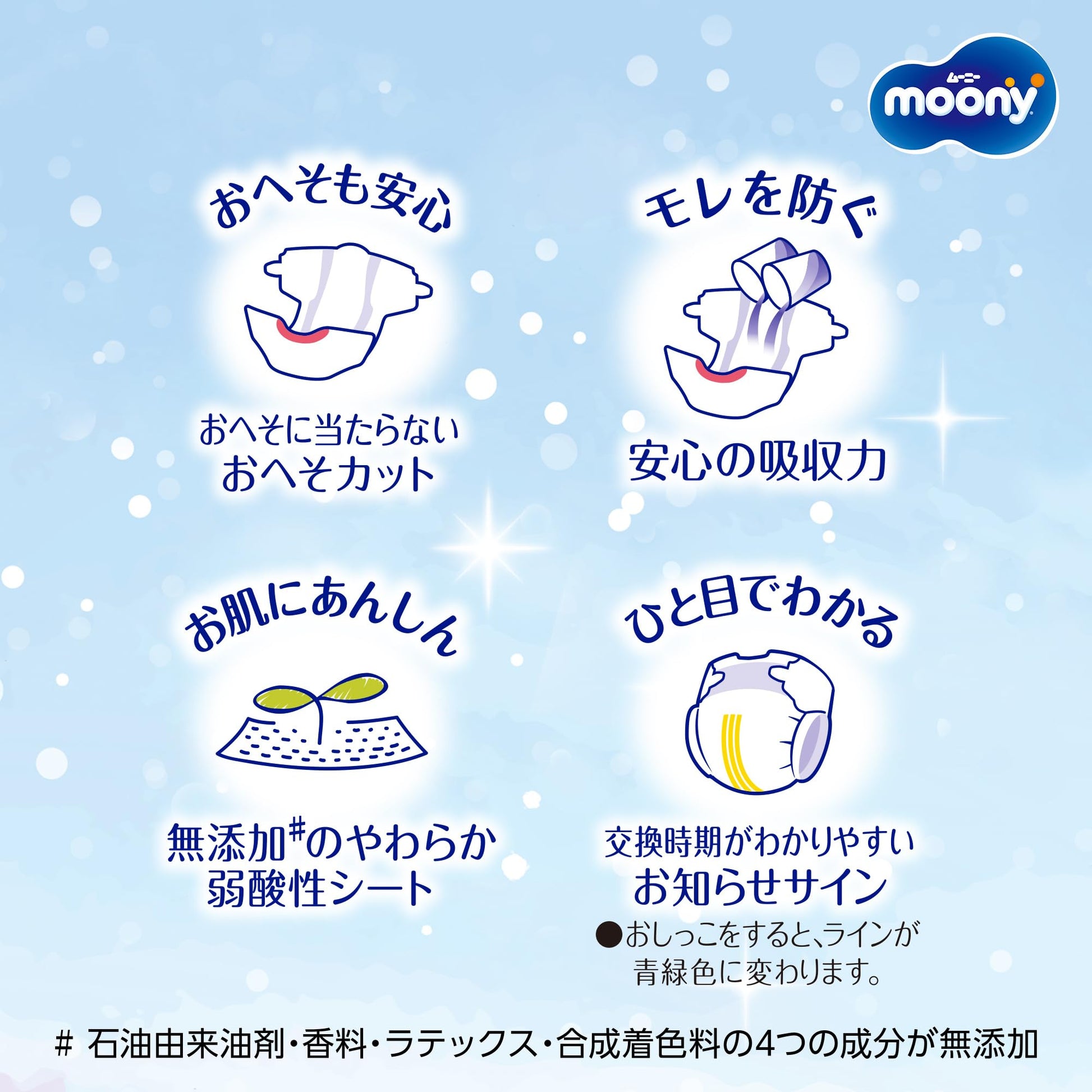 材質:表面材-ポリオレフィン不織布、吸収材-ポリエステル不織布/ポリオレフィン不織布/綿状パルプ/高分子吸収材、防水材-ポリオレフィンフィルム、止着材-粘着テープ、伸縮材-合成ゴム、結合材-ホットメルト粘着材、外装材-ポリエチレン