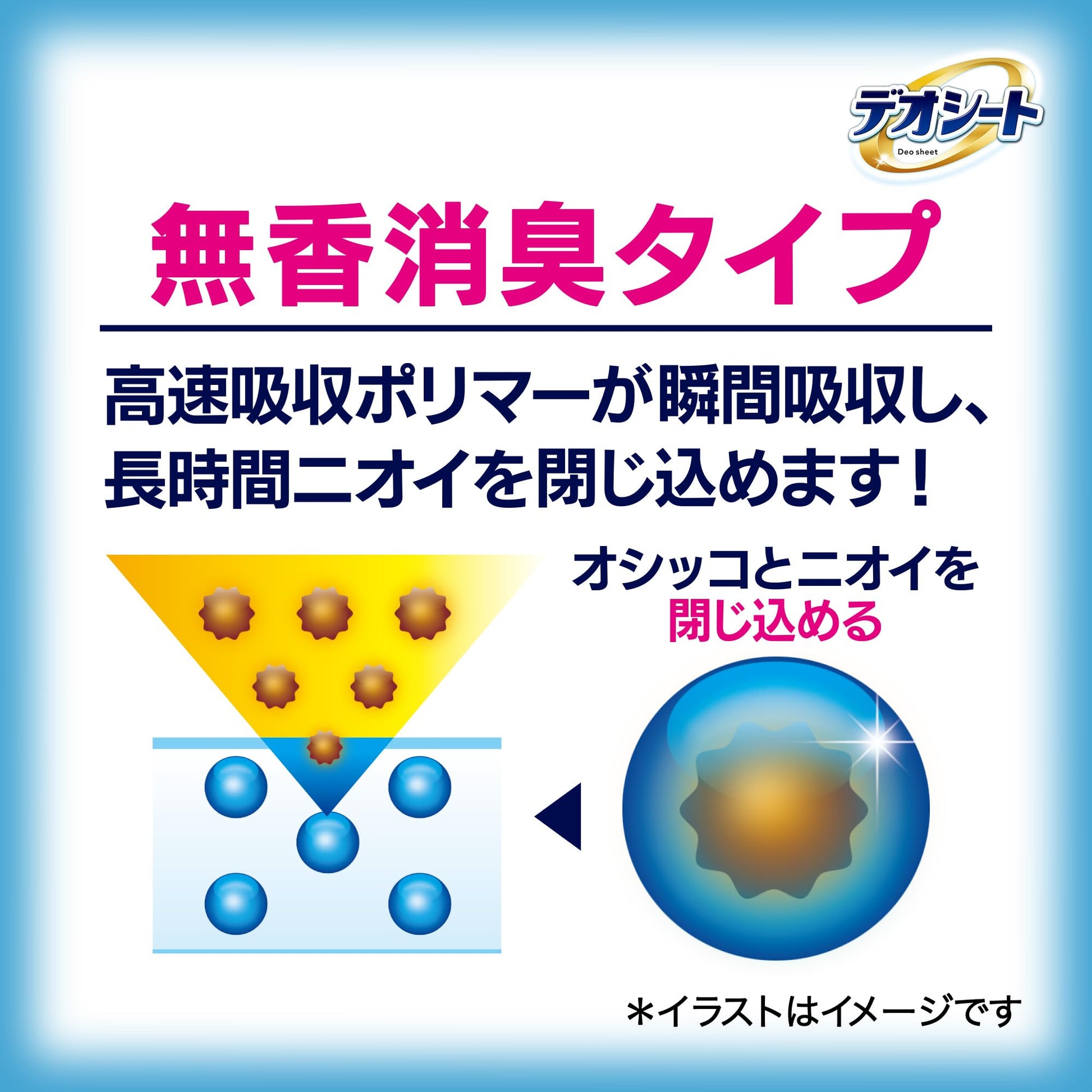 デオシート独自の瞬速とじこめ吸収体がオシッコを瞬間吸収して、表面サラサラ&オシッコ広がりが小さいペットシートです。高速吸収ポリマーがオシッコを瞬間吸収して長時間ニオイを閉じ込める無香消臭タイプ。オシッコ5回分(約250cc)をしっかり超吸収。※中型犬の平均オシッコ量から算出。※中型犬の平均オシッコ量から算出。シートサイズ:60×44cm(新聞紙大)