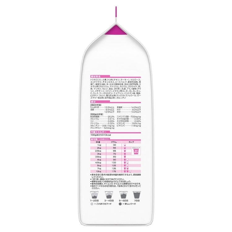給与量 1kg30g、2kg55g、2.5kg65g、3kg70g、3.5kg80g、4kg90g、4.5kg100g、5kg105g、7kg135g、10kg175g(200ccカップ1杯で約80g)