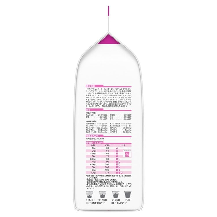 給与量 | 1kg30g、2kg55g、2.5kg65g、3kg70g、3.5kg80g、4kg90g、4.5kg100g、5kg105g、7kg135g、10kg175g (200ccカップ1杯で約75g) |