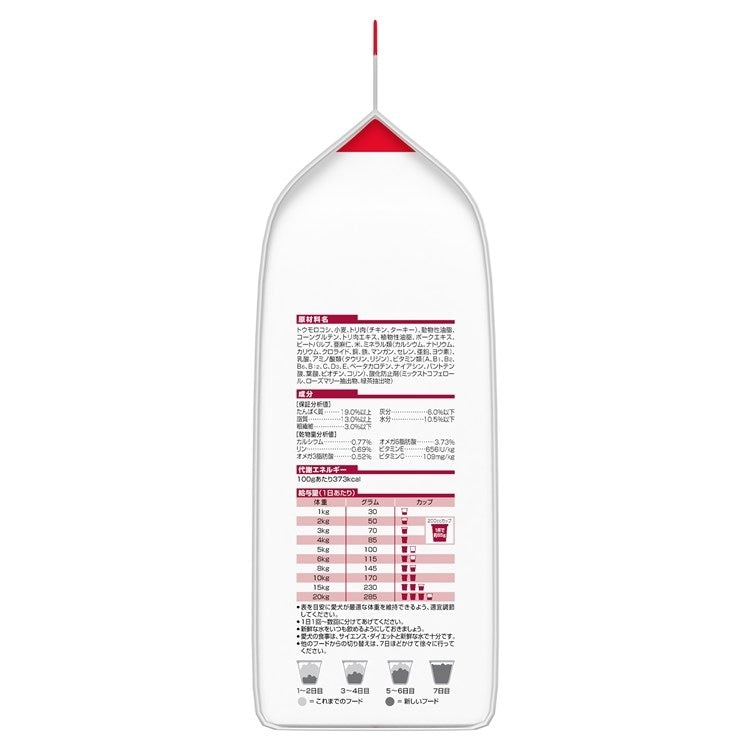 原材料名 | トウモロコシ、小麦、トリ肉(チキン、ターキー)、動物性油脂、コーングルテン、トリ肉エキス、植物性油脂、ポークエキス、ビートパルプ、亜麻仁、米、ミネラル類(カルシウム、ナトリウム、カリウム、クロライド、銅、鉄、マンガン、セレン、亜鉛、ヨウ素)、乳酸、アミノ酸類(タウリン、リジン)、ビタミン類(A、B1、B2、B6、B12、C、D3、E、ベータカロテン、ナイアシン、パントテン酸、葉酸、ビオチン、コリン)、酸化防止剤(ミックストコフェロール、ローズマリー抽出物、緑茶抽出物) |