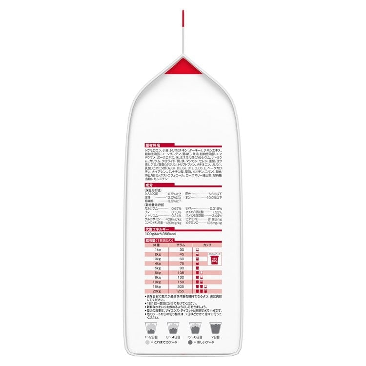 給与量 | 1kg30g,2kg45g,3kg60g,4kg75g,5kg90g,6kg105g,8kg130g,10kg150g,15kg205g,20kg255g (200ccカップ1杯で約90g) |