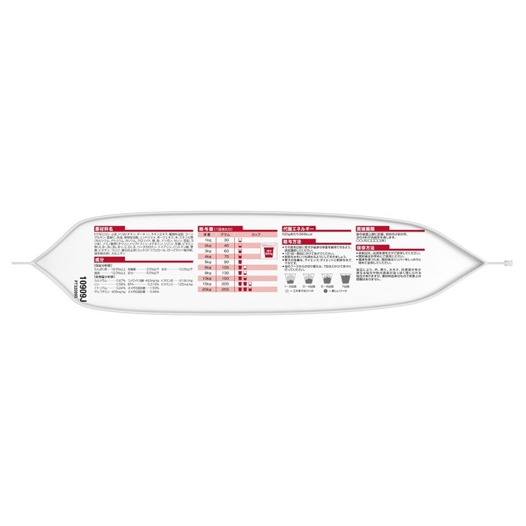 原材料名 トウモロコシ、小麦、トリ肉 ( チキン、ターキー )、動物性油脂、チキンエキス、コーングルテン、亜麻仁、ポークエキス、魚油、植物性油脂、エンドウマメ、米、ミネラル類(カルシウム、ナトリウム、カリウム、クロライド、銅、鉄、マンガン、セレン、亜鉛、ヨウ素)、アミノ酸類 ( タウリン、トリプトファン、メチオニン、リジン)、乳酸、カルニチン、ビタミン類 ( A、B1、B2、B6、B12、C、D3、E、ベータカロテン、ナイアシン、パントテン酸、葉酸、ビオチン、コリン )、酸化防止剤 (ミックストコフェロール、ローズマリー抽出物、緑茶抽出物)