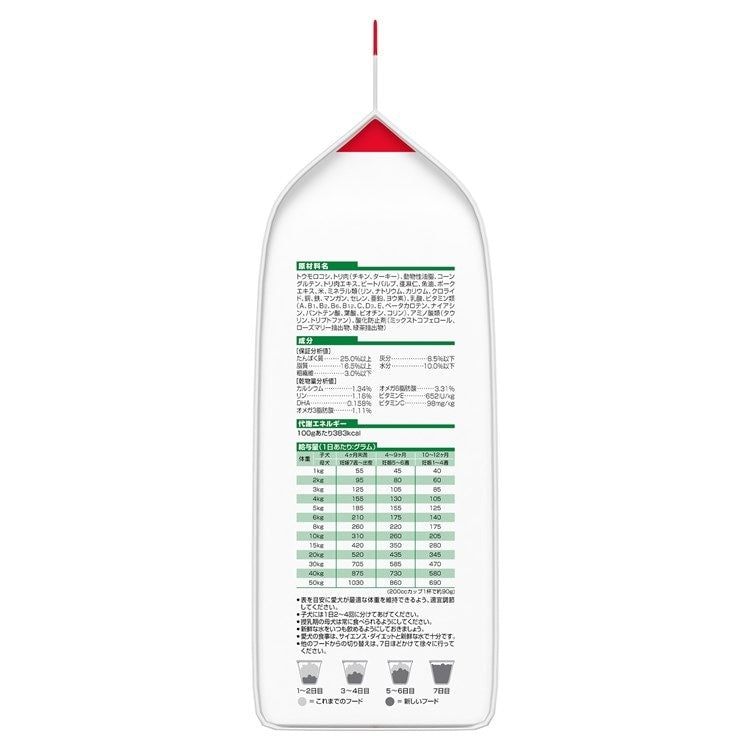 給与量 | (子犬4ヶ月未満/母犬妊娠7週~出産)1kg55g,2kg95g,3kg130g,4kg160g,5kg190g,6kg215g,8kg265g,10kg315g,15kg430g,20kg530g,30kg720g,40kg890g,50kg1055g,(子犬4~9ヶ月/母犬妊娠5~6週):1kg50g,2kg80g,3kg105g,4kg135g,5kg155g,6kg180g,8kg225g,10kg265g,15kg355g,20kg440g,30kg600g,40kg745g,50kg880g,(子犬10~12ヶ月/母犬妊娠1~4週):1kg40g,2kg65g,3kg85g,4kg105g,5kg125g,6kg145g,8kg180g,10kg210g,15kg285g,20kg355g,30kg480g,40kg595g,50kg705g (200ccカップ1杯で約90g) |