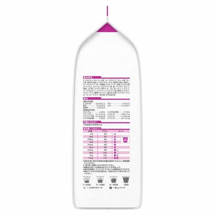 給与量 1kg30g、2kg50g、2.5kg60g、3kg70g、3.5kg80g、4kg85g、4.5kg95g、5kg100g、7kg130g、10kg170g
