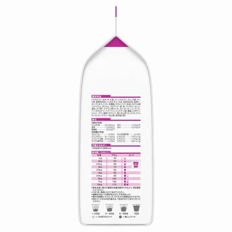 給与量 | 1kg30g、2kg50g、2.5kg60g、3kg70g、3.5kg80g、4kg85g、4.5kg95g、5kg100g、7kg130g、10kg170g (200ccカップ1杯で約90g) |