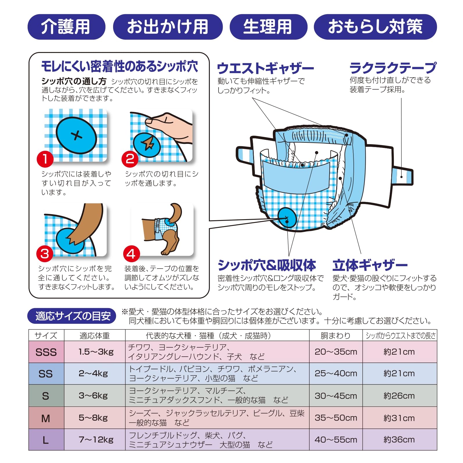 商品紹介動いても安心W(ダブル)ホールド。介護用・お出かけ用・生理用・おもらし対策etc・・・快適な生活に! ! ぴたっと密着しっぽ穴でモレ安心! しっかり超吸収ガードで長時間安心! 車、カフェ、室内ドッグランや、猫ちゃんにもご使用いただけます。 胴周り: 40~55㎝、適応体重: 7~12kg、しっぽからウエストまでの長さ: 36cm、代表的な犬種・猫種(成犬・成猫時):フレンチブルドッグ、柴犬、パグ、ミニチュアシュナウザー、大型の猫 など使用上の注意愛犬・愛猫の体型体格に合ったサイズをお選びください。原材料・成分ポリオレフィン不織布 ポリエチレン ポリエステル不織布(表面材) 綿状パルプ 吸水紙 高分子吸収材(吸収材)ポリエチレンフィルム(防水材) 粘着テープ(止着材)ポリウレタン(伸縮材) ホットメルト粘着材(結合材)