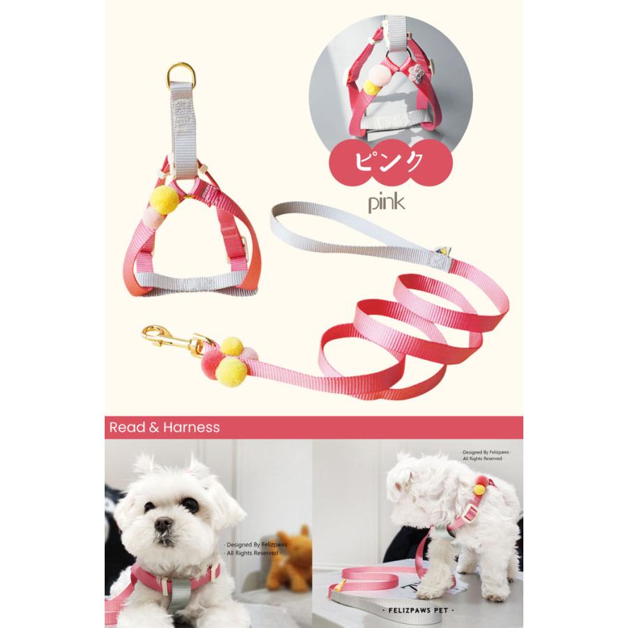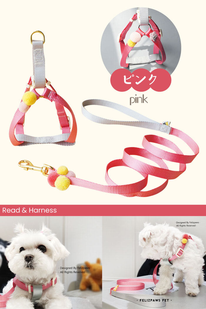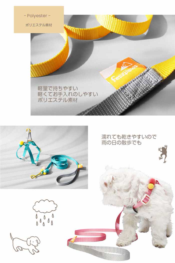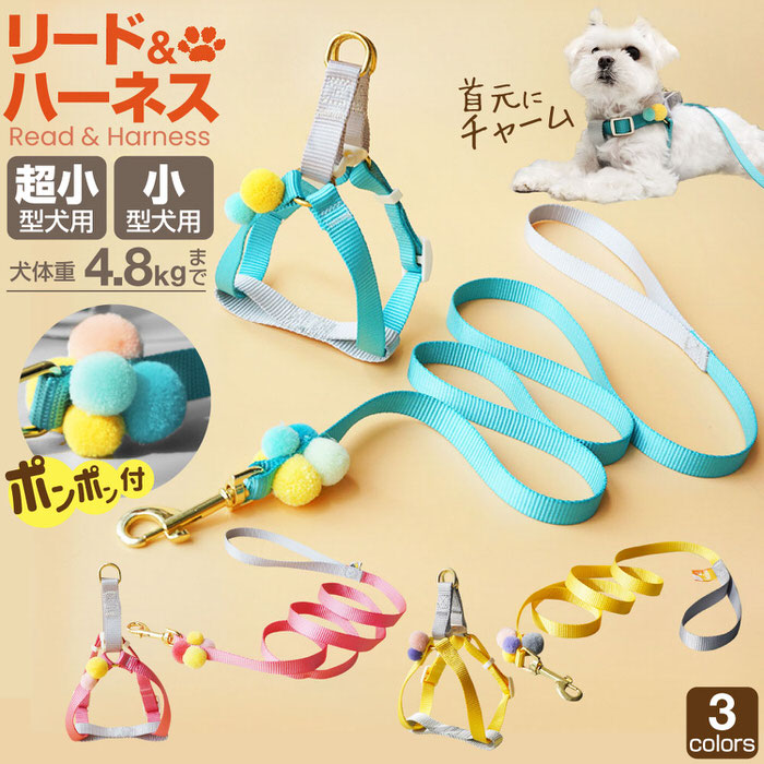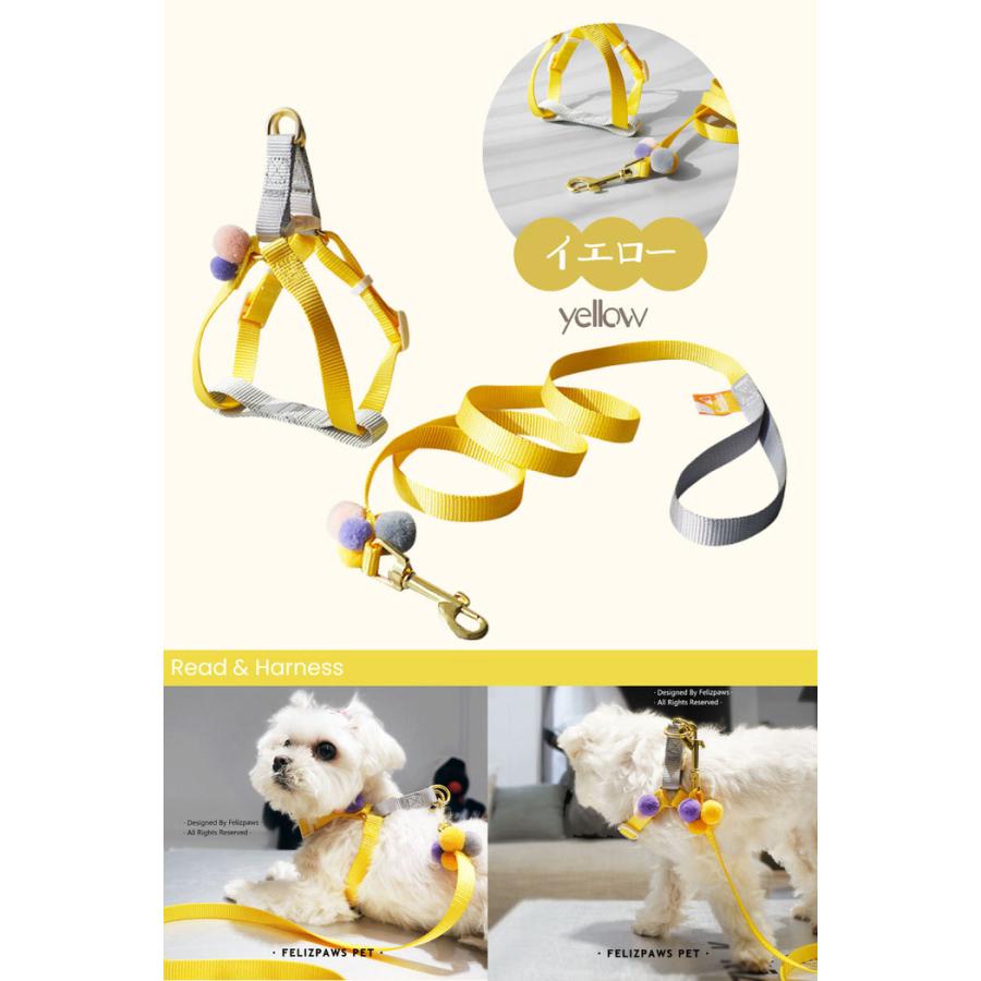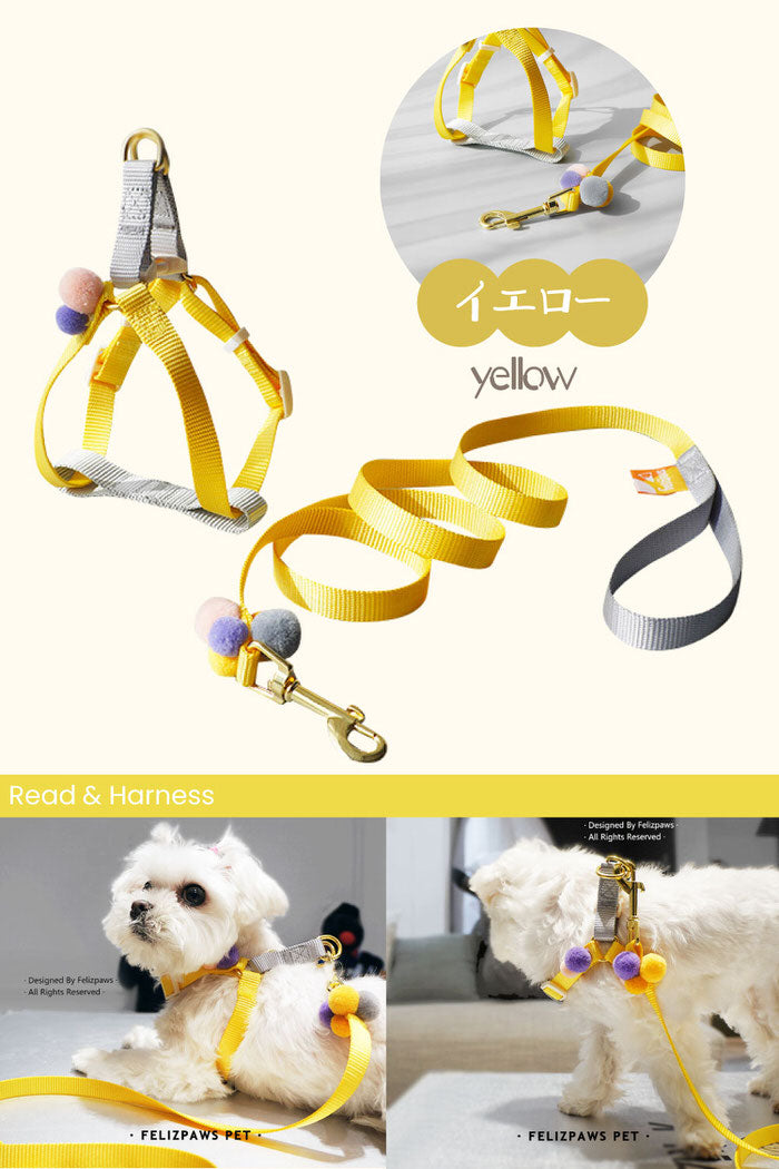 ペット 犬 イヌ 犬用 ドッグ リード付き リードハーネス ハーネスリード おしゃれ 胴輪 リード ピンク イエロー 可愛い かわいい ぽんぽん ハーネス 小型犬 簡単着脱 調整可能 散歩 安全 ファッション ソフトハーネス