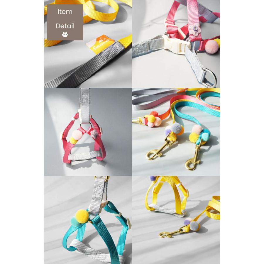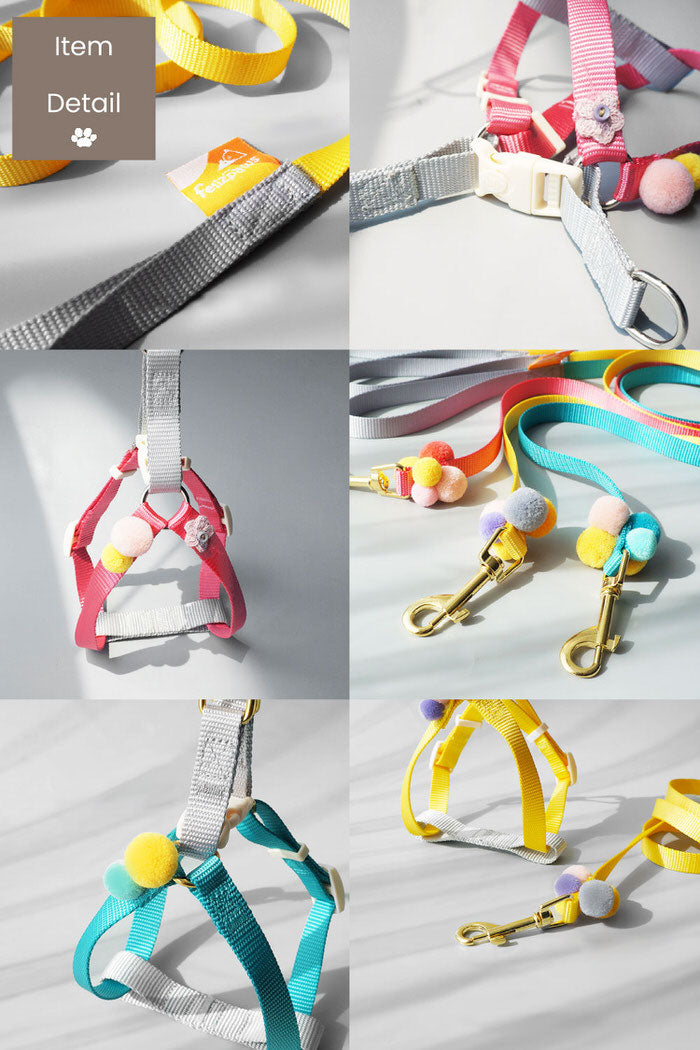 ピンク イエロー エメラルドグリーンの3色。ハーネスのポンポンがちょうど首元に来るデザイン