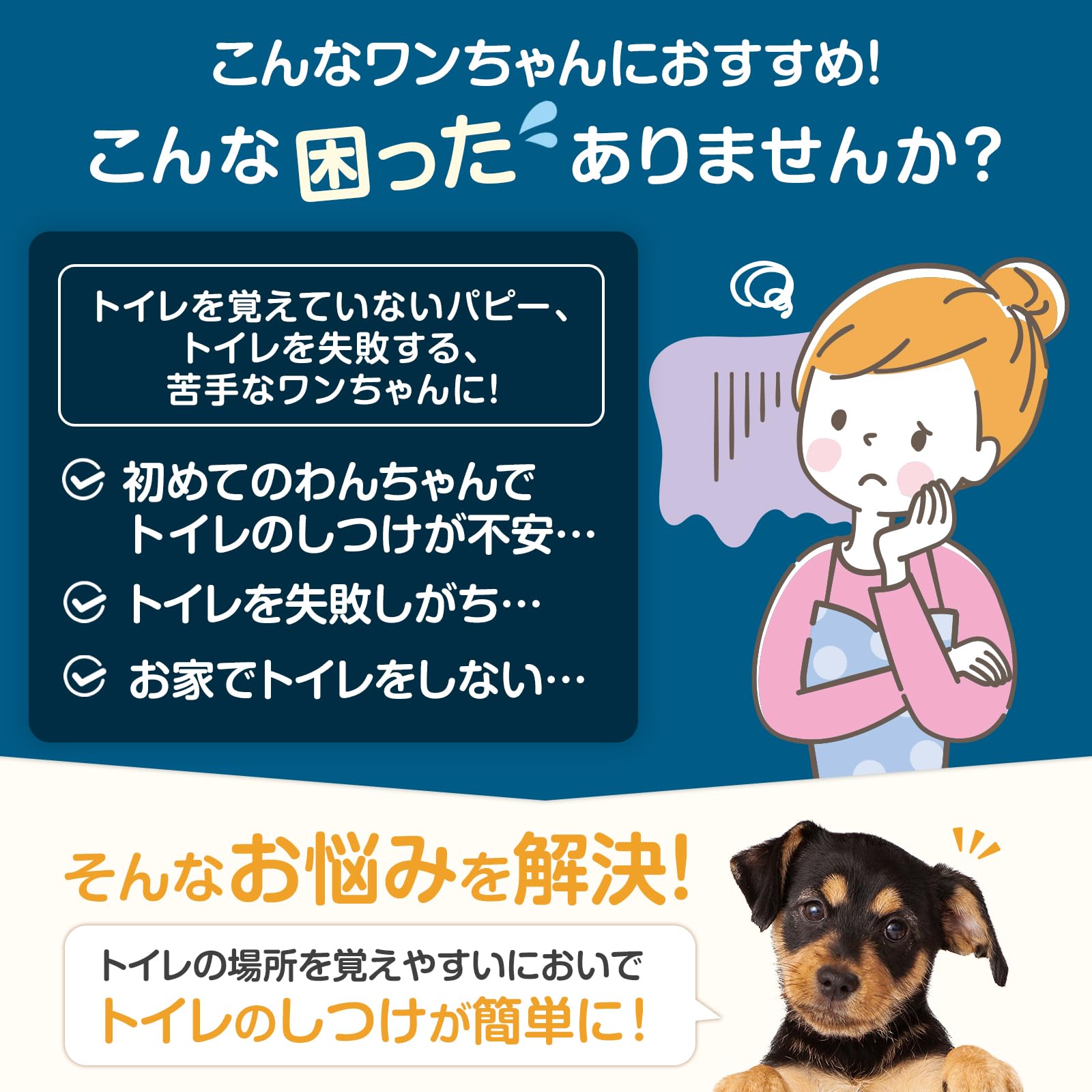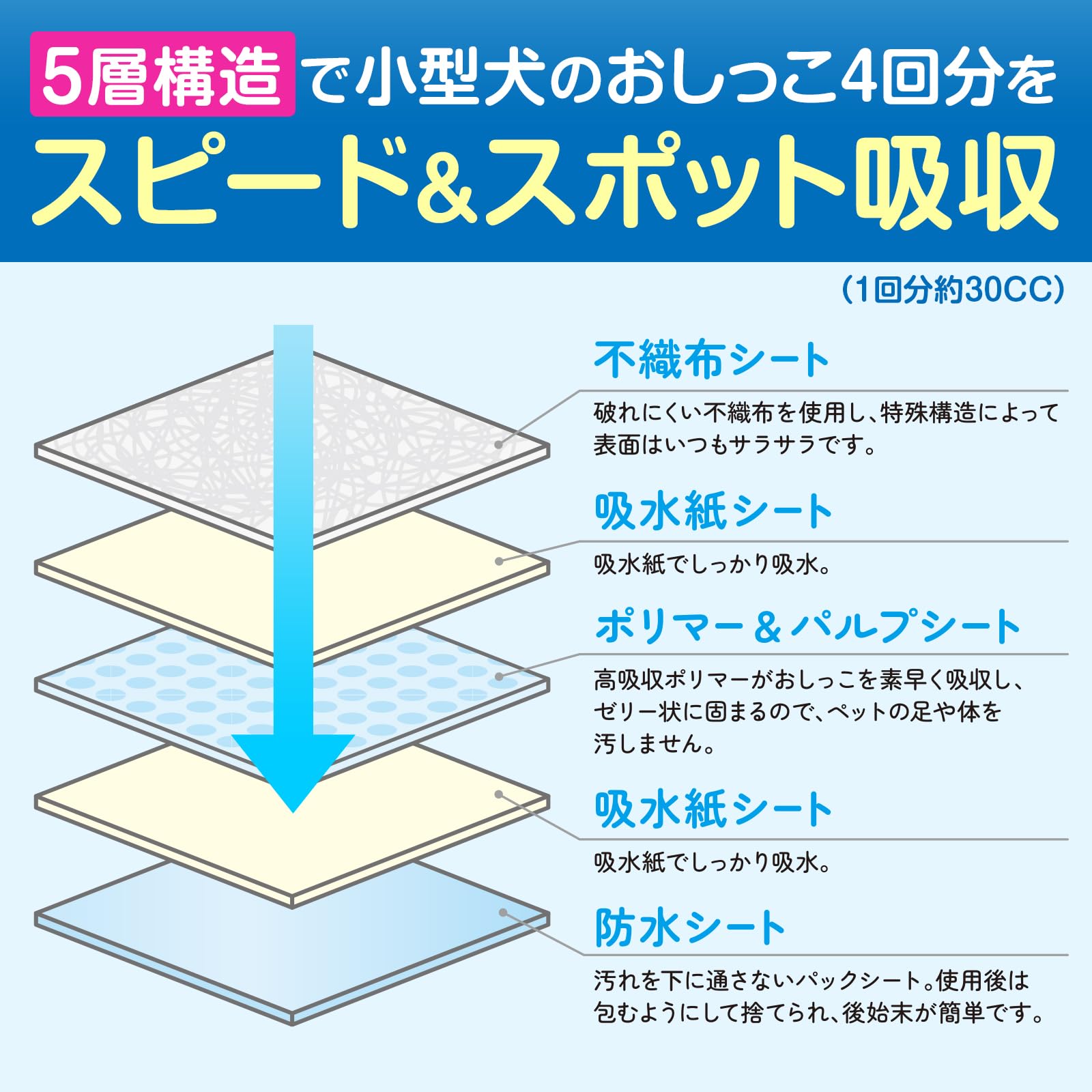 トイレの場所を覚えやすいニオイが1.2倍*!パピーのトイレトレーニングをサポートするシーツです。5層構造(不織布シート・吸水紙シート・ポリマー&パルプシート・吸水紙シート・防水シート)で小型犬のおしっこ4回分(1回約30cc)をスピード&スポット吸収。パッケージのQRコードから獣医師推奨のトイレトレーニング動画が見ることができます。幼犬だけでなく、成犬にもご使用いただけます。(*当社従来品との比較)シーツサイズ:約33×47cm