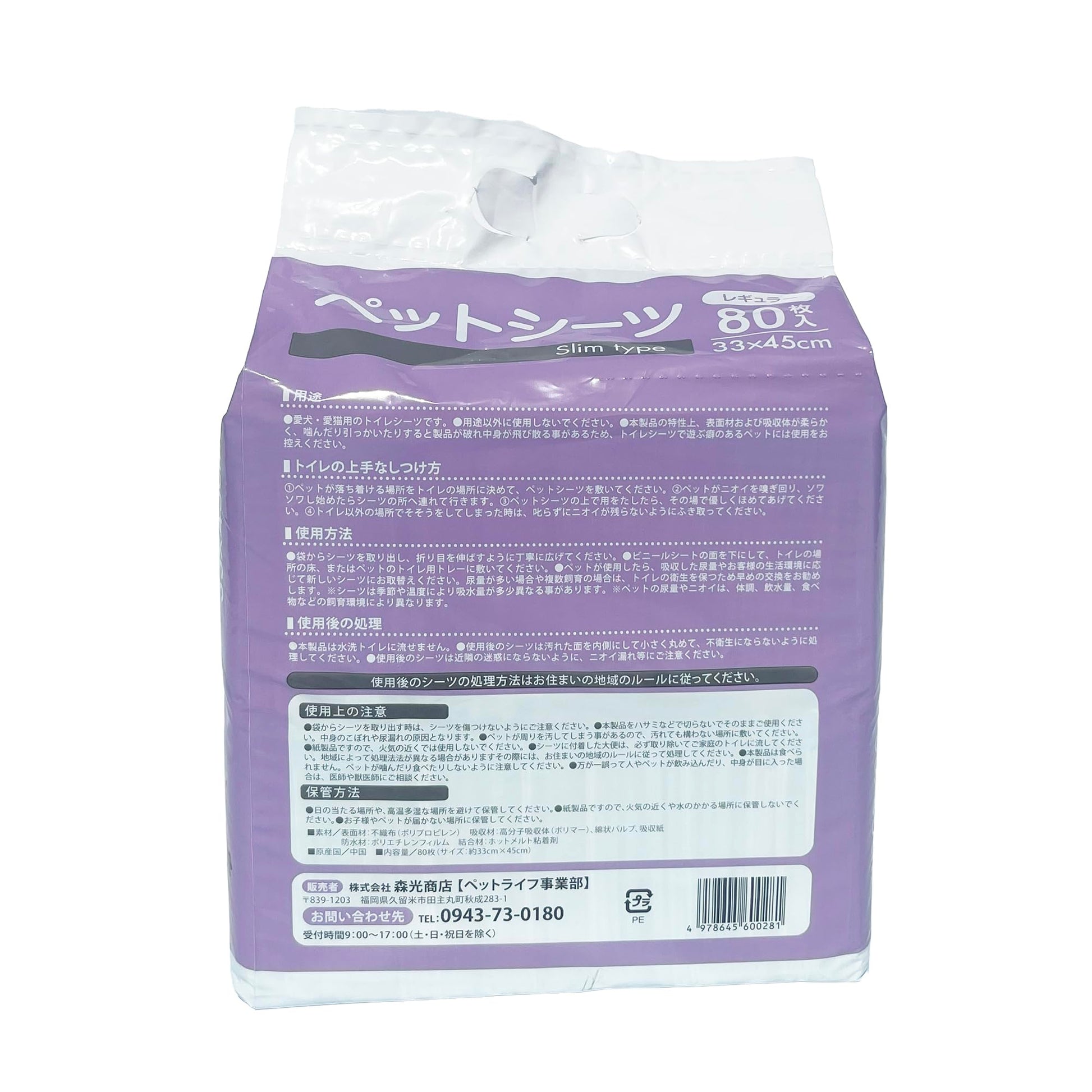 ペットライフクリエイトは「人とペットが、幸せな関係であってほしい」を理念に、ペットが快適で健康に暮らせるようペットの「衣・食・住・健康」を提案します。ペットシーツスリム レギュラーは、使い捨てタイプでいつも清潔を保てる愛犬・愛猫用のトイレシートです。綿状パルプと高分子吸収体(ポリマー)がおしっこをすばやく吸収し、イヤなニオイもしっかり脱臭してくれます!シーツの下に敷いてそそう防止にもご利用いただけます。スリムタイプだからストックしてもすっきり収納できて、外出先の持ち運びにも便利!ゴミ捨ての際にもかさばりにくい経済的な薄型シーツです。パッケージサイズ : 約 幅 23.5cm x 高さ 21cm x 奥行 13.5cm / シートサイズ : 33cm x 45cm