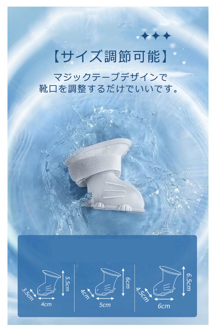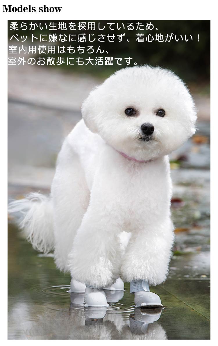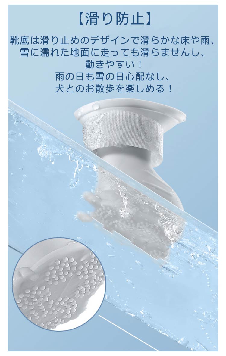 【履き心地が良い】 防水、柔らかい材質なので、ワンちゃんの足に負担をかけません。 柔らかい生地を採用しているため、ペットに嫌なに感じさせず、着心地がいい! 室内用使用はもちろん、室外のお散歩にも大活躍です。 【滑り防止】 靴底は滑り止めのデザインで滑らかな床や雨、雪に濡れた地面に走っても滑らませんし、動きやすい! 雨の日も雪の日心配なし、犬とのお散歩を楽しめる! 【脱げにくいデザイン】 ストラップ伸縮性があり、らせん状に巻き上げるようにして固定するため、激しい動きでも脱げにくいです。 【サイズ調節可能】 マジックテープデザインで靴口を調整するだけでいいです。 主な用途: ★皮膚炎・キズ・炎症の悪化防止に! 肉球が怪我や病気の時に、怪我をした部位の舐め防止としても役立ちます。 また塗り薬を舐めてしまったり包帯を剥がしてしまうことも防止。 ★散歩の時の足の保護にも! 雨の日の散歩でも脚先が濡れず、汚れからもガード。 夏場の焼けたアスファルトや冬場の寒さや、舗装されていない道の危険物からも愛犬の脚先を守ります。 ★室内飼いでの床傷防止に! 室内飼いでの悩み、「ツメによる床の傷」を着用することで床や家具を保護することもできます。 車に乗るときのシートの保護にも使えます。 | |
