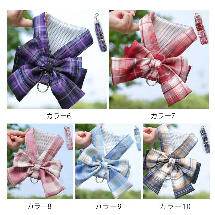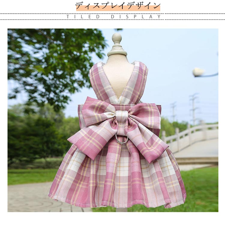 リボンワンピーススタイルがオシャレなハーネスとリードセット!2点セット チェックワンピース 犬 ハーネスリード 小型犬 中型犬 ステップハーネス ウェアハーネス 胸背 ペットウェア 犬用 介護用 首輪