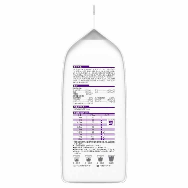 原材料名 米、トリ肉(チキン、ターキー)、玄米、トウモロコシ、コーングルテン、大麦、オート麦、動物性油脂、チキンエキス、植物性油脂、ビートパルプ、亜麻仁、ポークエキス、乳酸、ミネラル類(ナトリウム、カリウム、クロライド、銅、鉄、マンガン、セレン、亜鉛、ヨウ素)、ビタミン類(A、B1、B2、B6、B12、C、D3、E、ベータカロテン、ナイアシン、パントテン酸、葉酸、ビオチン、コリン)、アミノ酸類(タウリン)、酸化防止剤(ミックストコフェロール、ローズマリー抽出物、緑茶抽出物)