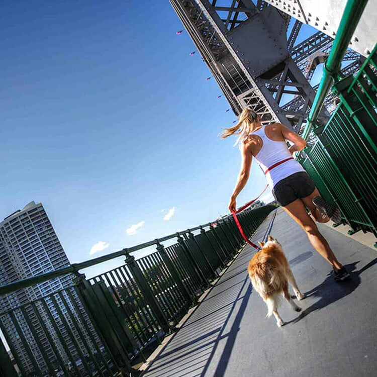 ショック吸収機能付きで愛犬の首やオーナー様への負担が軽減される、「腰に巻くタイプ」のリード。