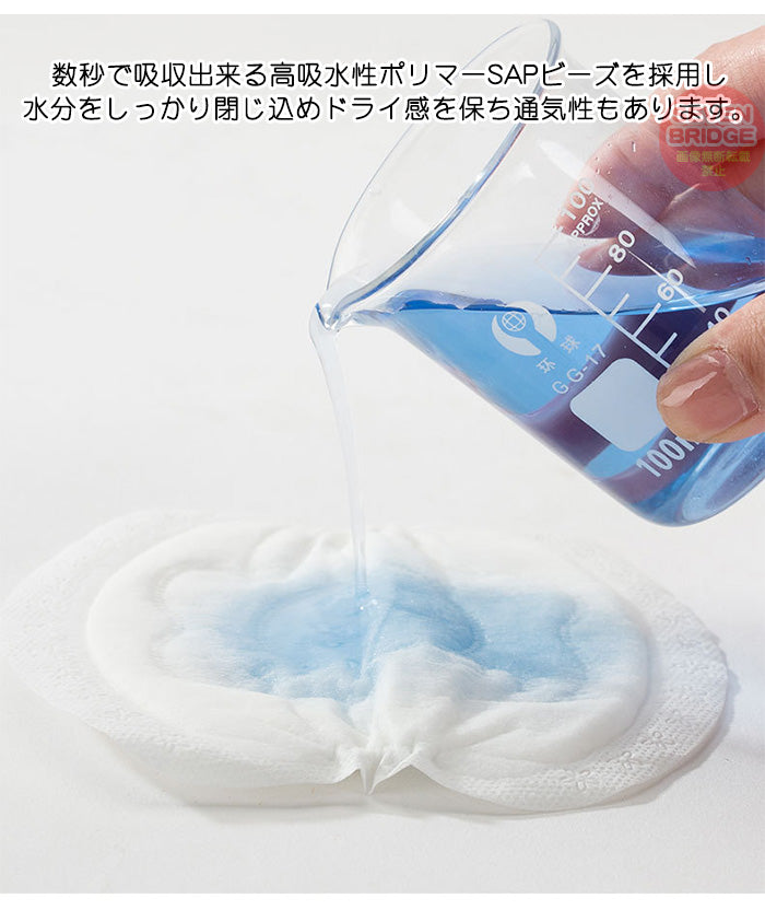 数秒で吸収出来る高吸水性ポリマーSAPビーズを採用し水分もしっかり閉じ込めドライ感を保ち通気性もあります。
