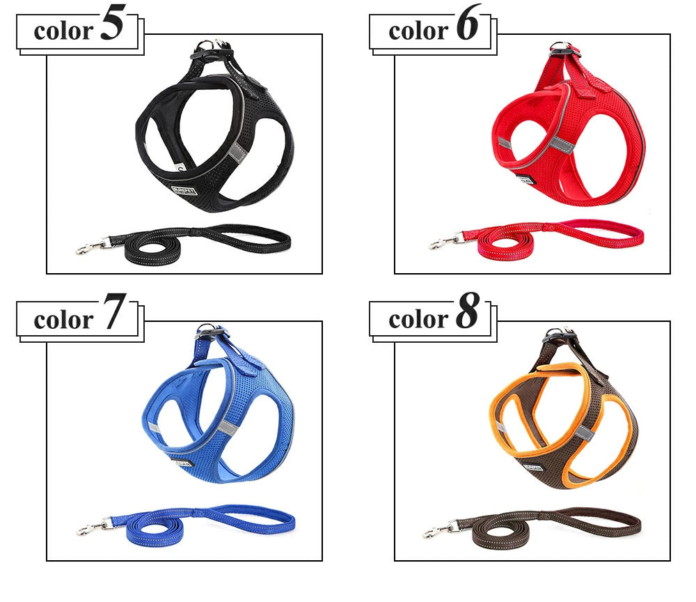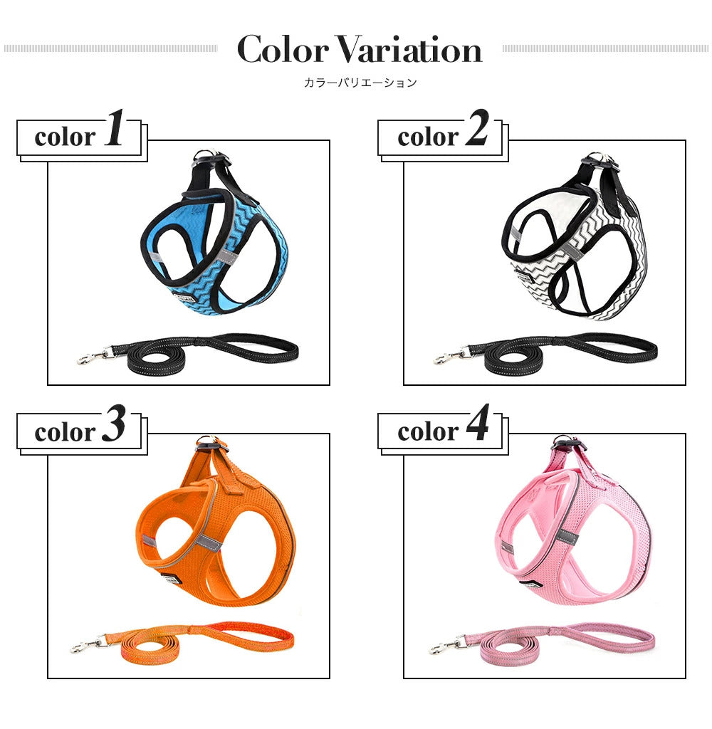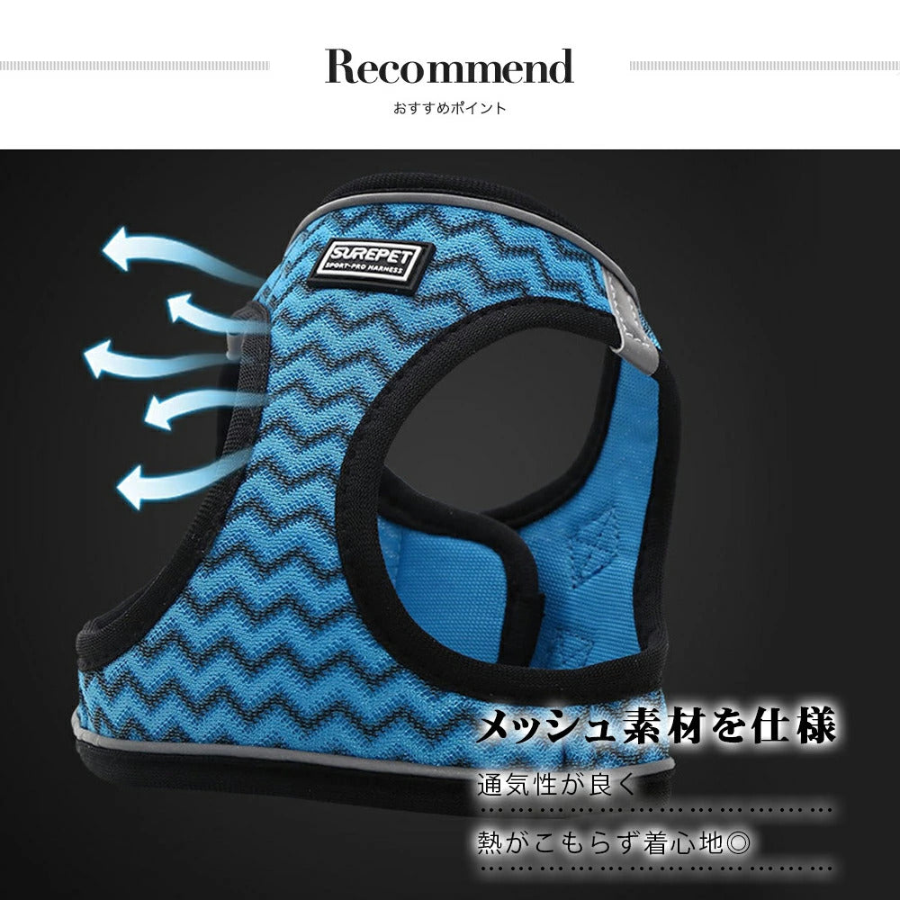 ディテール | メッシュ素材を仕様通気性が良く熱がこもらず着心地◎ 付け心地◎力が均等に分圧されワンちゃんへの負担が軽減 着脱しやすいマジックテープで簡単だから動くワンちゃんにピッタリ 反射ステッチ入りリードには反射ステッチがついているから夜道で便利 |