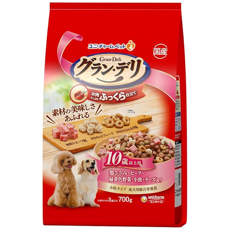 【即納】グラン・デリ グランデリ ドッグフード ソフト ふっくら仕立て シニア 10歳以上用 鶏ささみ・ビーフ・緑黄色野菜・小魚・チーズ・角切りビーフ粒入り 700g 国産 ユニチャーム