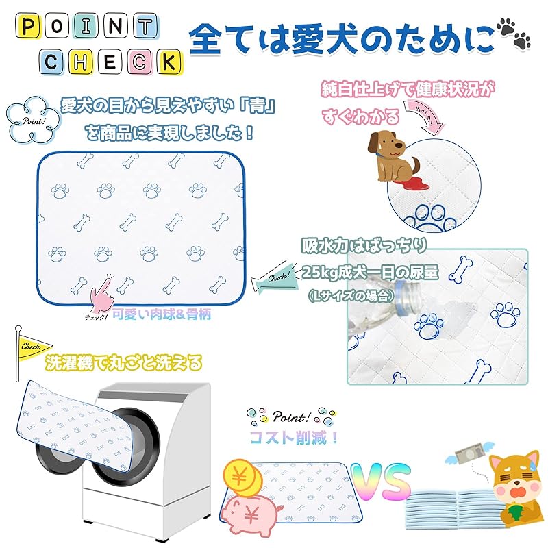 🐶【健康のバロメーター】排泄物は犬にとって健康のバロメーターとなる大切な指標となります。一瞬ですぐわかる純白仕上げなので、愛犬の健康状態の異変に気づくことができます。 🐶【独自な青色オーバーロック】犬は人間のような色を感じる細胞である錐状体がないため、黒、白、黄色、青しか見えません。愛犬にとって最も認識しやすい青色のオーバーロックと可愛い柄デザインにより、おしっこをする場所を素早く見つけることができます。 🐶【吸水速乾・漏れ防止・抗菌】試作を重ねて厳選された高品質な素材は吸収性・速乾性に優れ、4層構造で設計されており、漏れや細菌の繁殖を防ぐ快適性を実現します。 🐶【幅広い使い方】小中大型犬、猫、ウサギ、モルモットなどに適した洗えるペットシーツです。特に妊娠中や授乳中のペット、失禁や糖尿病などの病気で介護が必要なペットに適しています。床だけでなく、ソファ、ペット用トイレ、ペット用ベッド、犬小屋、ペット用キャリーバッグ、ペットサークルやペットケージ、外出時や旅行時の車内でも安心にご利用頂けます。 🐶【エコで繰り返し利用可能】使い捨ておしっこシートに比べ、経済的で環境にもやさしいです。このペット用おしっこマットは柔らかく耐久性があり、お手入れが簡単で、洗濯機で丸ごと洗うことができます。速乾性に優れ、洗濯を繰り返しても壊れにくく、何度でも繰り返し使用できます。折りたたみで収納・保管できるのも便利です。