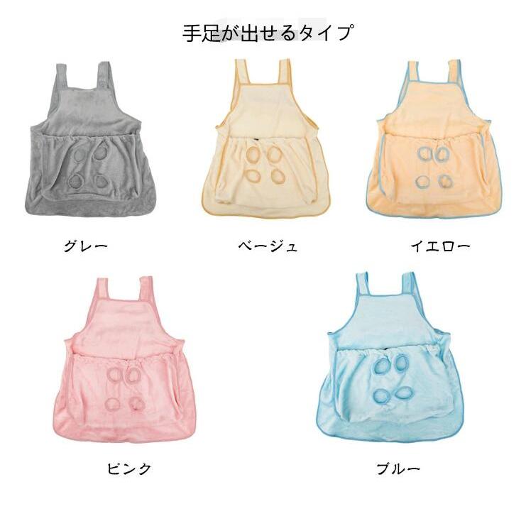 2タイプ×5色選べる! 手足を出せる穴あき抱っこエプロン。 穴あき設計で、愛猫の爪切りや耳かきなどお手入れがより簡単に。 ふわふわで暖かく、猫や小型犬を入れるためのエプロンです。 両面フランネル素材で作られるので、ふわふわでペットの肌にも優しいです。 内側の暖かい空気を逃さない高い保温性を持っています。 ポケットに調整できる紐が付いて、ペットの飛び出し防止できます。 後ろがボタンが付いており、着脱も楽になります。 | |