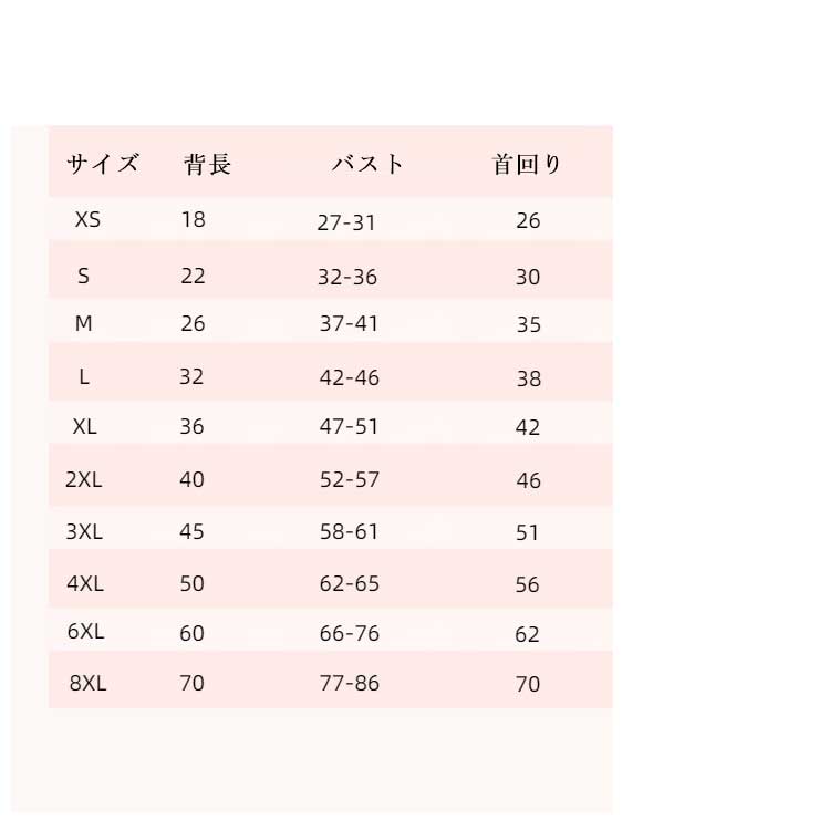 詳しくは写真の通り。XS:おすすめ体重0.5-1kgS:おすすめ体重1.5-2.5kgM:おすすめ体重3-5kgL:おすすめ体重5.5-7.5kgXL:おすすめ体重8-10.5kg2XL:おすすめ体重11-13.5kg3XL:おすすめ体重14-17.5kg4XL:おすすめ体重18-22.5kg6XL:おすすめ体重23-35kg8XL:おすすめ体重35.5-45kg※商品のサイズは手作業で測定させて頂いておりますので、若干の誤差があります。