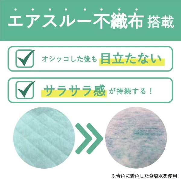 ●表面材に高機能不織布エアスルーを使用することにより、触り心地が柔らかく、オシッコを吸収した後のサラサラ感がUP