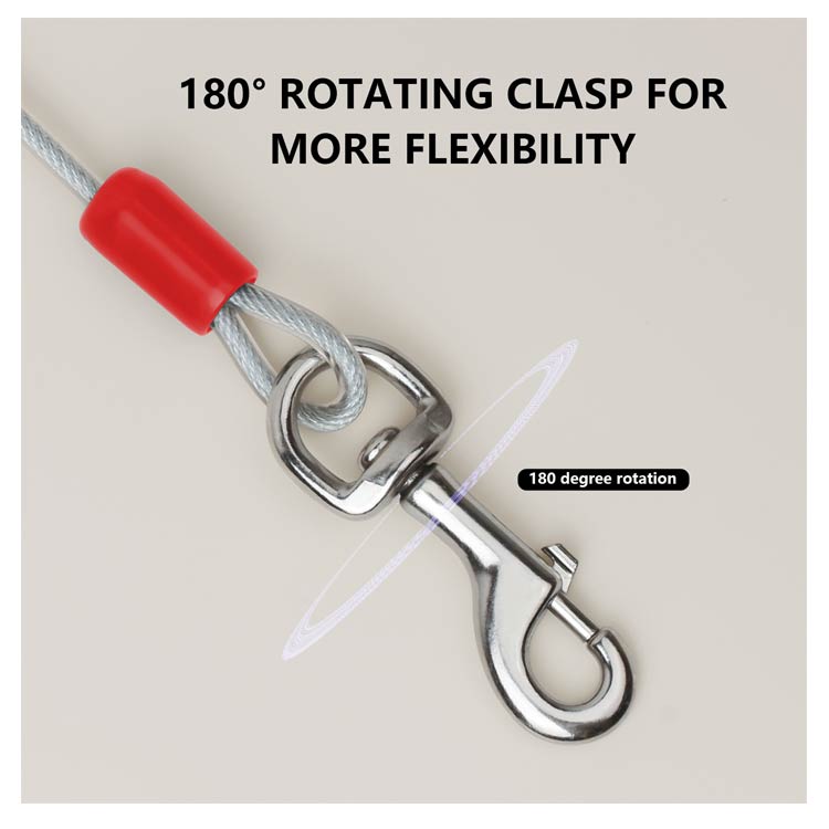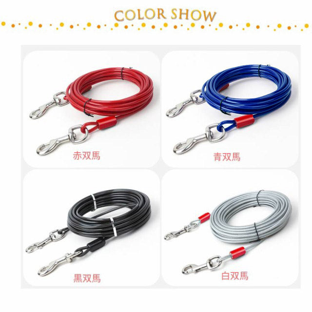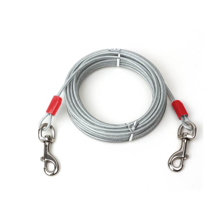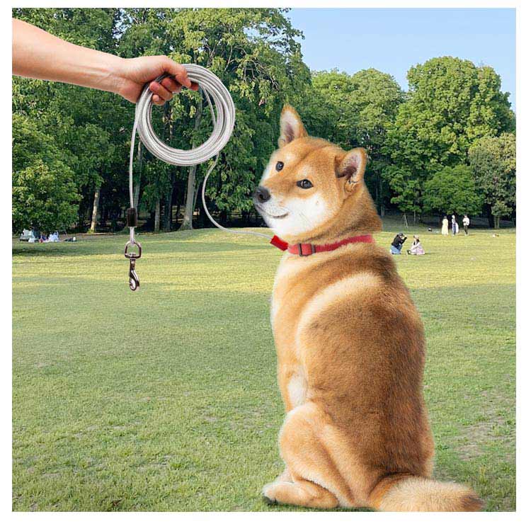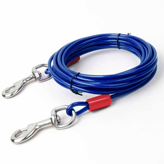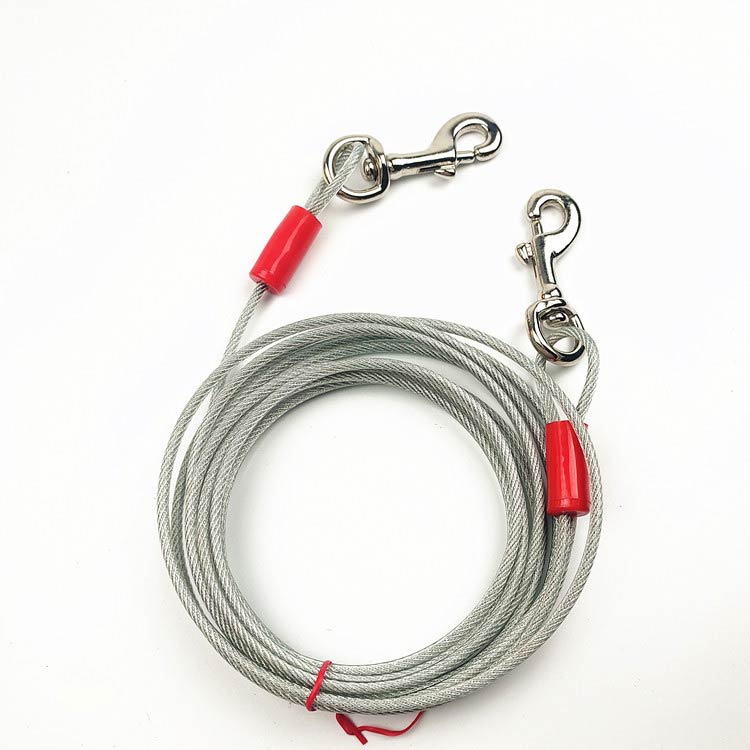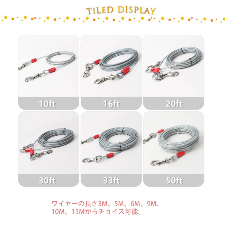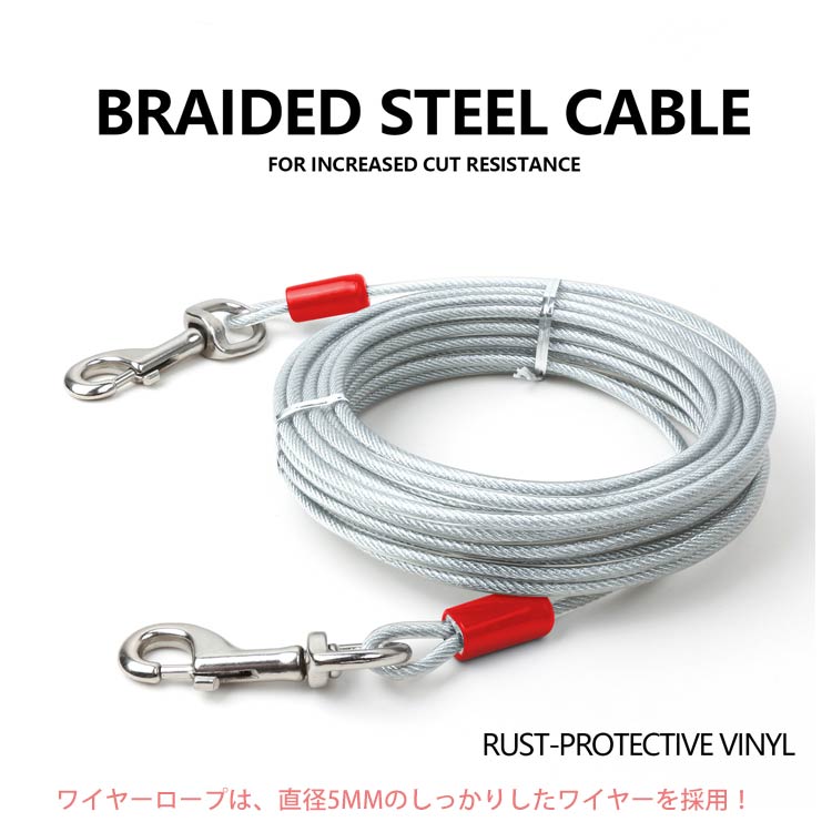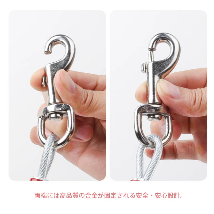 最長15m!高耐久性の切れないリード。両端には高品質の合金が固定される安全・安心設計。ワイヤーの両先端は大きめのナスカンを使用し、ポールやリードに繋ぎやすい。ワイヤーロープは、直径5mmのしっかりしたワイヤーを採用!ワイヤーの長さ3m、5m、6m、9m、10m、15mからチョイス可能。