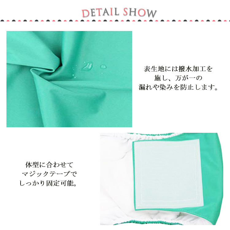 脱げない、ズレない、漏れないマナーベルト。体型に合わせてマジックテープでしっかり固定可能。裏側はメッシュ地になっているので、蒸れにくく、通気性抜群。表生地には撥水加工を施し、万が一の漏れや染みを防止します。お腹部分の上下にはゴムを入れ、体にフィットしやすい作りになっています。マーキング防止・お漏らし防止・生理・介護などあらゆるシーンで便利にご利用頂けます。ドッグカフェや友人宅などへの外出の際の必需品です。