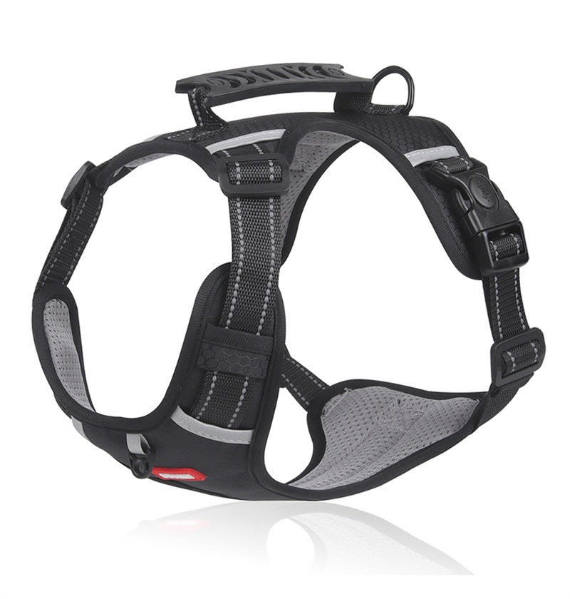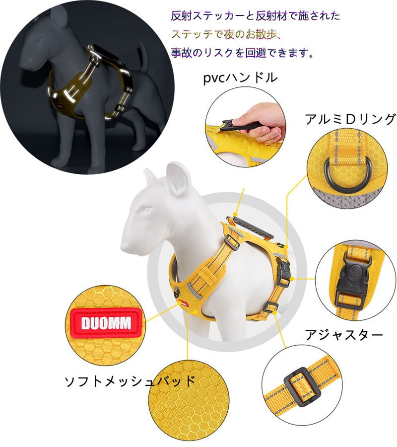 【高機能性】エルゴノミクスデザインで、引っ張り防止&愛犬への負担が少ない。呼吸器が弱い犬や老犬に適しています。 1、反射ステッカーと反射材で施されたステッチで夜のお散歩、事故のリスクを回避できます。 2、改良版PVCハンドルは従来のモデルより、安全性、利便性が大幅にアップします。愛犬の急な動きに制御しやすい、介護が必要な愛犬の場合は段差や階段のサポート時に役立ちます。 3、Dリングはアルミニウム合金製で耐衝撃性、軽量、耐腐食性と硬度があります。超大型犬の引きにも耐えます。
