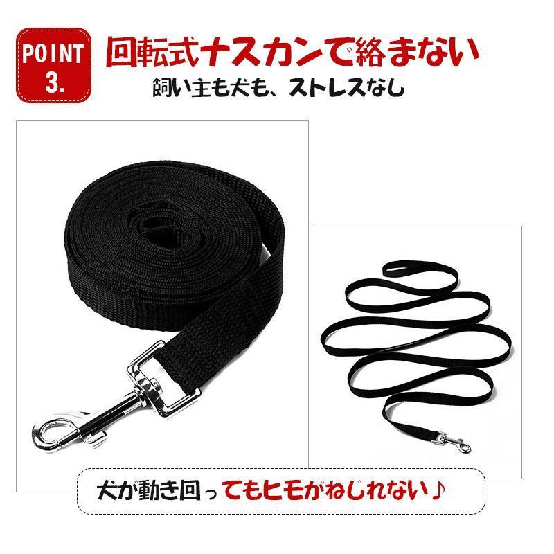 本製品の犬用リードは約15mのロングタイプで、小型から大型犬までご使用いただけます。耐久性に優れたナイロン素材を採用しているため、どんなに動き回っても切れにくく思いっきり遊ぶことができます。