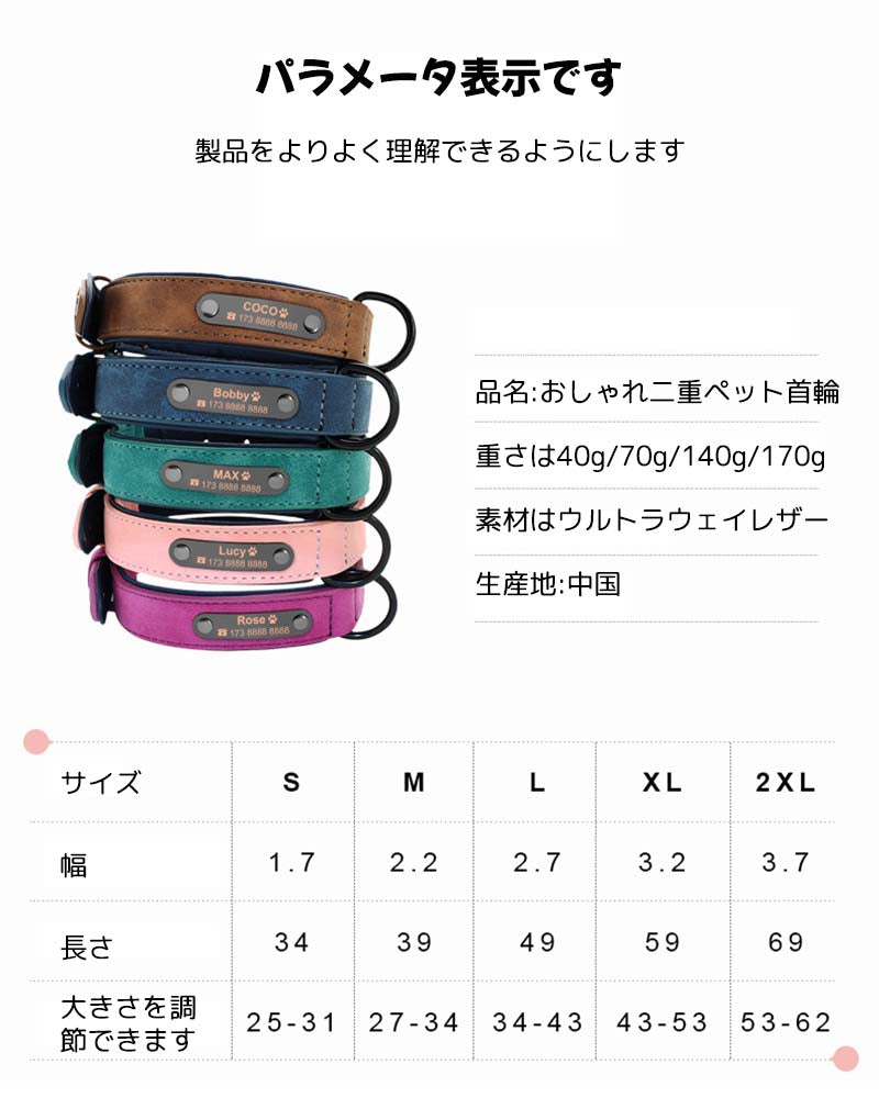 【素材&サイズ調節可能】:手触りよく耐久性がいい革製の首輪です。猫の首には優しいですそして耐久性もいいです。色はピンク、ブルー、パープル、グリーン、ブラウン、黒6色選択可能です。Sサイズは幅1.7cm、25〜31cm間に調整可能で、Mサイズは幅2.2cm、27〜34cm間に調整可能で、Lサイズは幅2.7cm、34〜43cm間に調整可能で、XLサイズは幅3.2cm、43〜53cm間に調整可能で、XXLサイズは幅3.7cm、53〜62cm間に調整可能です。