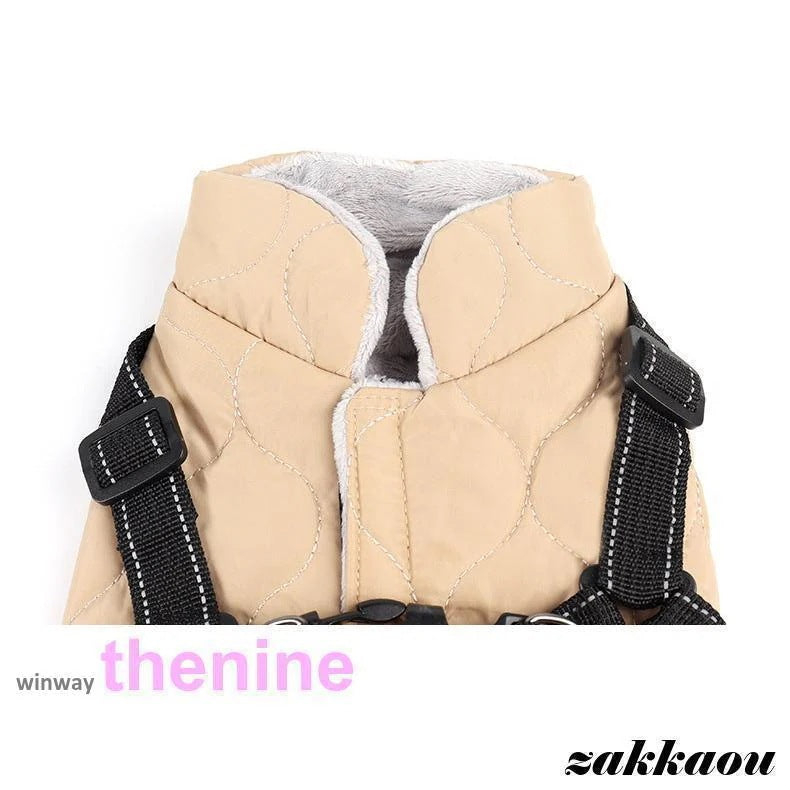 ハーネスとジャンパーが一体になった防寒ジャンパー。背中はマジックテープ仕様、より簡単にリードをつけることができます