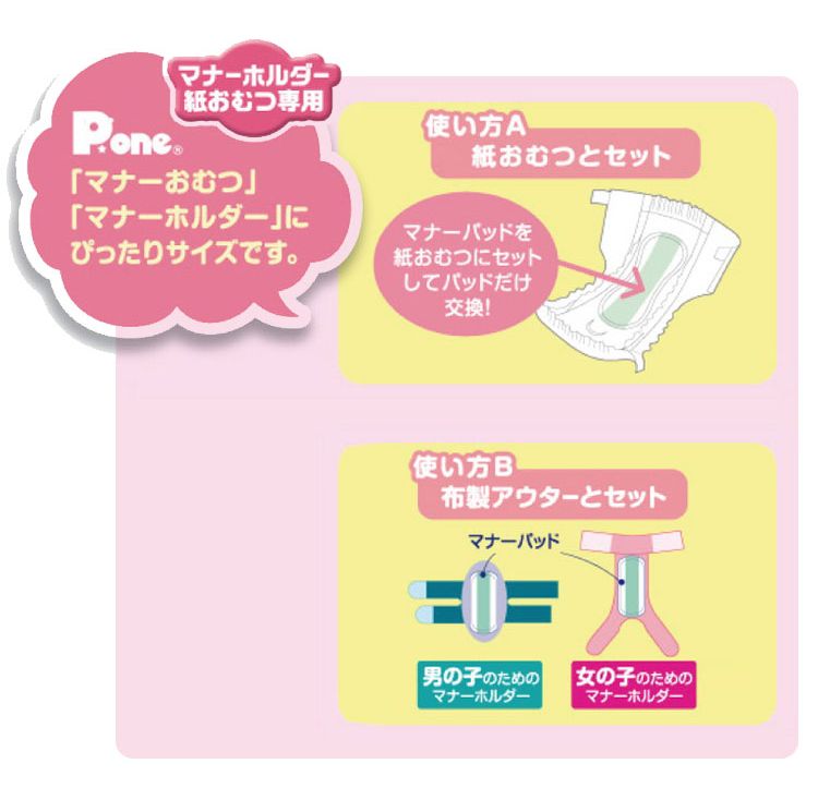 「マナーホルダーActive」や「マナーおむつ のび~るテープ付」等、様々なアウターにお使い頂けます。