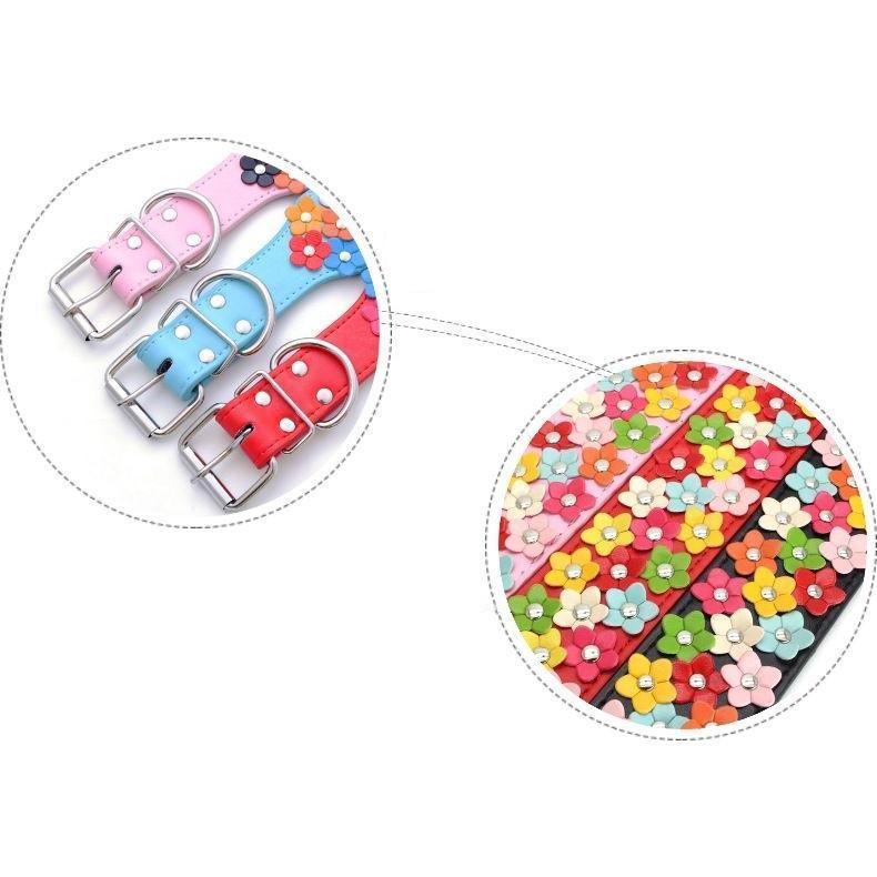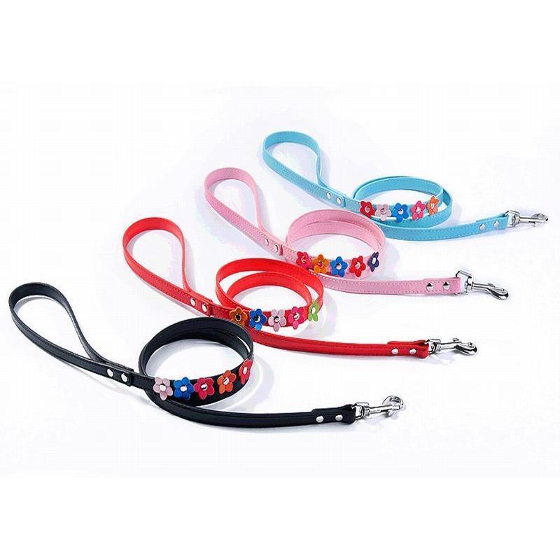 首輪 リード 犬用 ペット用 単品 幅広 カラー スタッズ 牽引紐 散歩紐 ドッグ 鋲 花 フラワー フェイクレザー かわいい カラフル ベルト おし