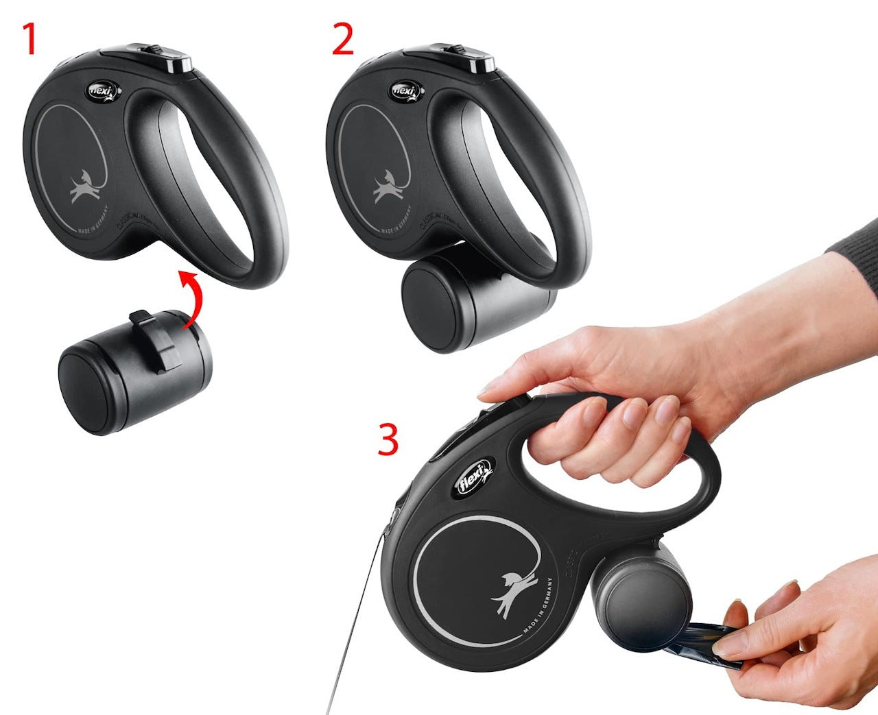 ・フレキシリードの取っ手の下に取り付けてあるので、散歩の邪魔になりません。