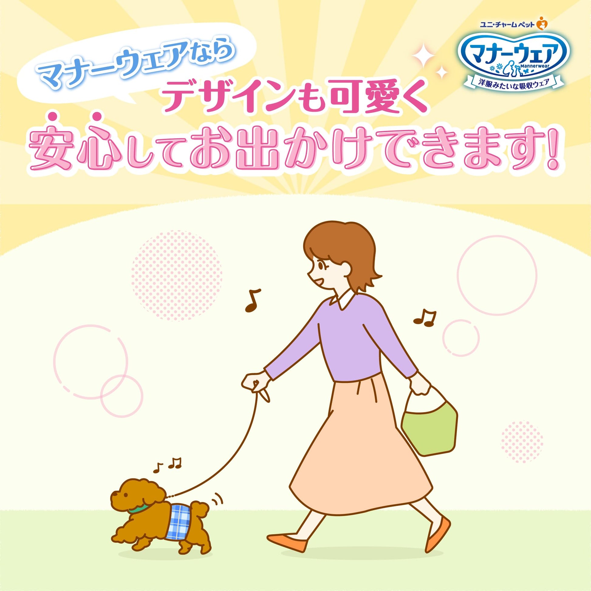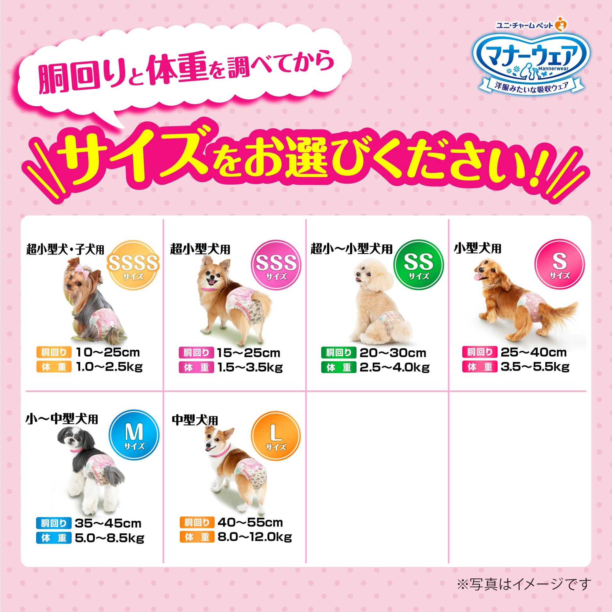 商品紹介・「マナーウェア女の子用」は、そそう・生理にも安心、洋服みたいな吸収ウェアです ・お出かけ・お部屋でのそそう・生理に安心!旅行、ドライブ、お散歩に ・洋服感覚、2種のおしゃれなデザイン ・「やわらかスリムフィット形状」で、嫌がらない ・「ぴったりサイドギャザー」で、すきまモレ安心 ・「安心スリム吸収体」で、6時間分のおしっこを吸収※健康なワンちゃんの6時間の平均おしっこ量を参考(ワンちゃんのおしっこ量には個体差があります)使用方法【適応サイズ(胴囲)】10~25cm 【適応体重】1.0~2.5kg 【代表的な犬種(成犬時)メス】子犬、チワワ、ヨークシャーテリア、ティーカッププードルなど