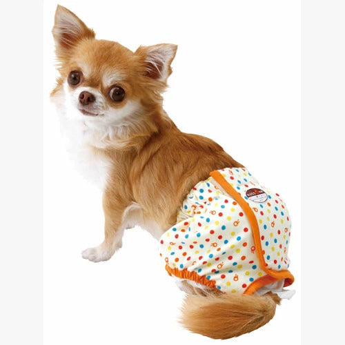 使用方法 | 1)紙おむつ(別売)がしっかり装着されているか確認してください。 ※紙おむつの詳しい使用方法については紙おむつのパッケージ裏面を確認してください。 2)足を通し背中側で面ファスナーをしっかりとじてください。 ※ワンちゃんの毛を巻き込まないように注意してください。 3)装着が完了したら、ズレがないか確認しながら、しっかりフィットするように調節してください。 |