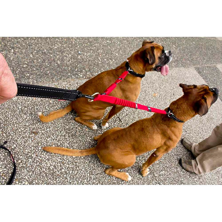 愛犬の首やオーナー様への負担が軽減されるショック吸収機能付き、2頭引き用延長リード。
