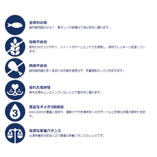 たんぱく質の供給源として新鮮な魚を使用し、魚由来のオメガ3およびオメガ6をバランスよく豊富に摂取することが可能です。