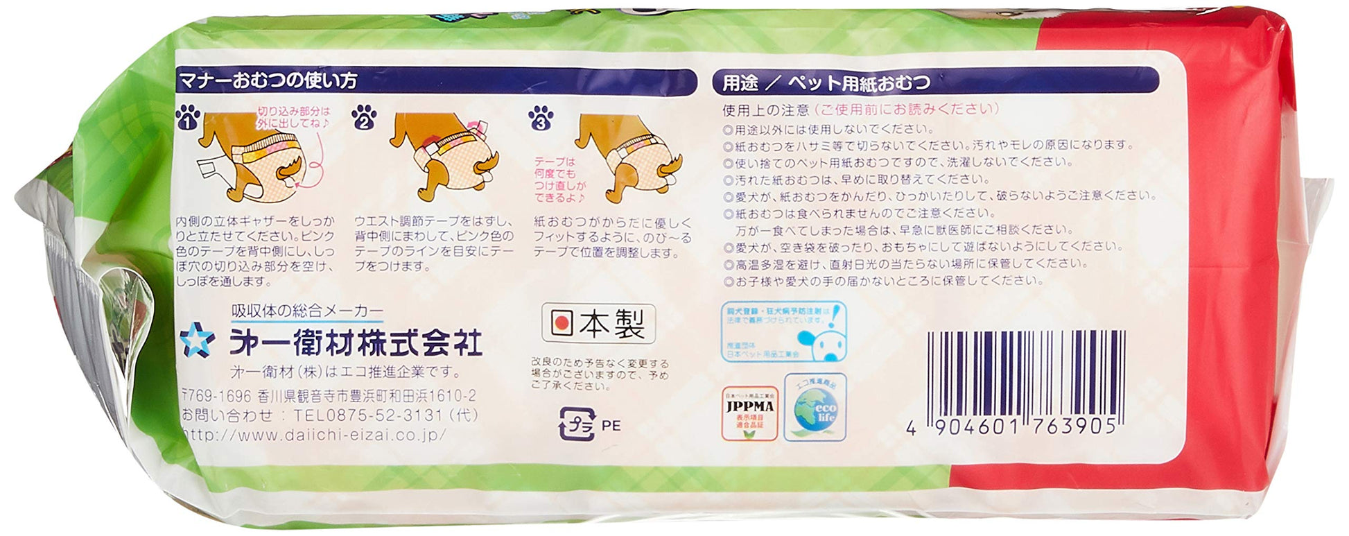 商品紹介ペット業界初の伸縮性の良いのび~るテープを採用し、フィット感UP! ウエストバンド伸縮バンドも新しくなりよりズレにくくなりました。新波型ストライプシート採用で、吸収スピードもUP! 逆戻り極小です。おでかけ・おもらし・生理・マーキング・介護など、パピーからシニアまでずっと安心して使える紙おむつです。原材料・成分表面材:ポリエチレン、ポリエステル系不織布 吸収材:綿状パルプ、吸収紙、高分子吸水材 防水材:ポリエチレンフィルム 止着材:面ファスナー 伸縮材:ポリオレフィン系エラストマー 結合材:ホットメルト