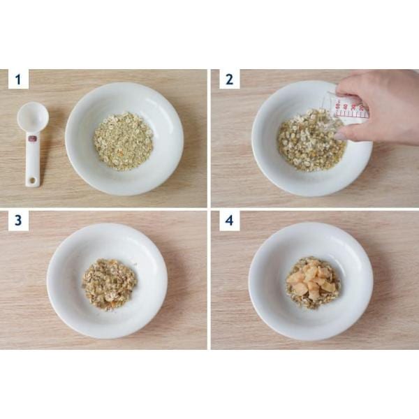 (1)ベースデリにお湯を同量~2倍かけて良く混ぜます。1~3分ほどおいてやわらかさを調整します。
