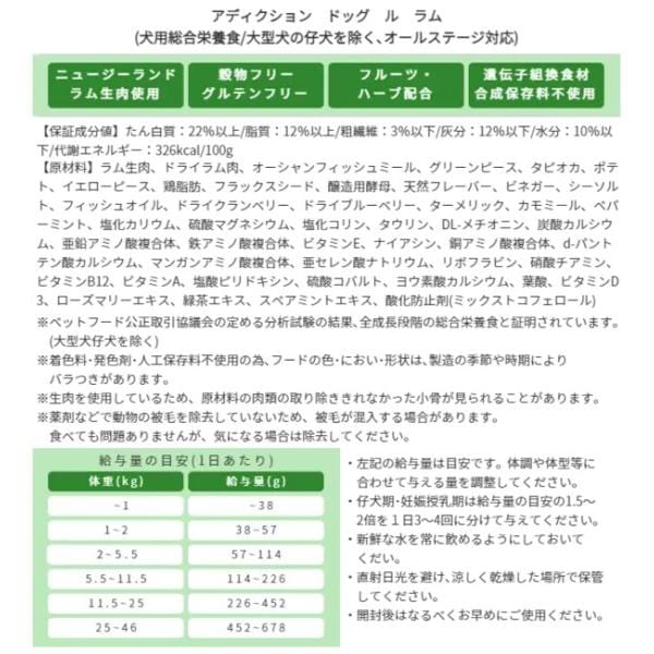 ラム生肉、ドライラム肉、オーシャンフィッシュミール、グリーンピース、タピオカ、ポテト、イエローピース、鶏脂肪、フラックスシード、醸造用酵母、天然フレーバー、ビネガー、シーソルト、フィッシュオイル、ドライクランベリー、ドライブルーベリー、ターメリック、カモミール、ペパーミント、塩化カリウム、硫酸マグネシウム、塩化コリン、タウリン、DL-メチオニン、炭酸カルシウム、亜鉛アミノ酸複合体、鉄アミノ酸複合体、ビタミンE、ナイアシン、銅アミノ酸複合体、d-パントテン酸カルシウム、マンガンアミノ酸複合体、亜セレン酸ナトリウム、リボフラビン、硝酸チアミン、ビタミンB12、ビタミンA、塩酸ピリドキシン、硫酸コバルト、ヨウ素酸カルシウム、葉酸、ビタミンD3、ローズマリーエキス、緑茶エキス、スペアミントエキス、酸化防止剤(ミックストコフェロール)