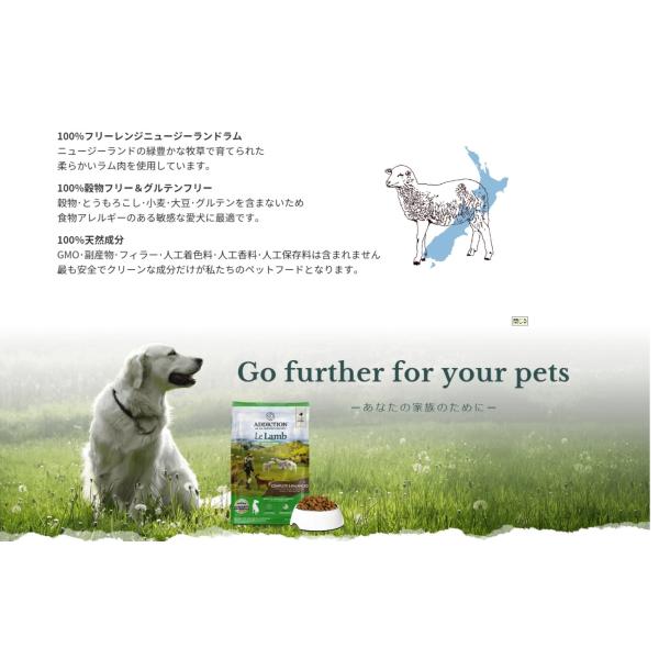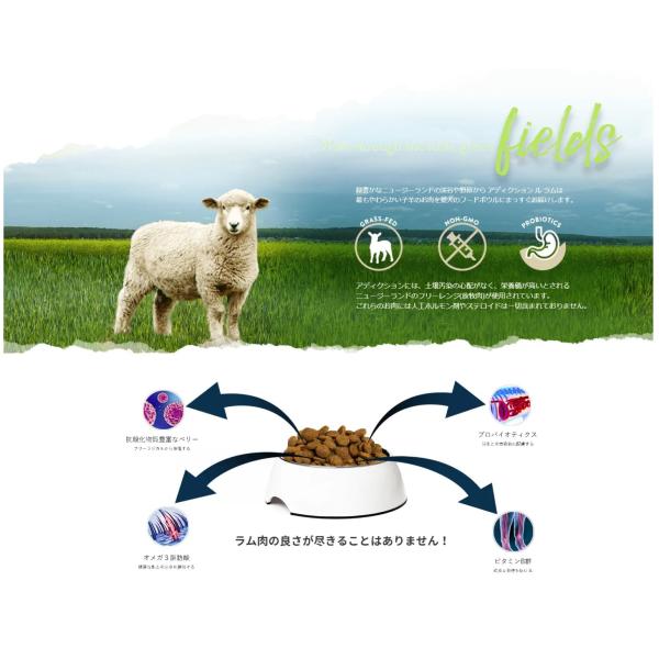 ニュージーランド産フリーレンジラム肉と、様々なハーブ類、日光を沢山浴びたベリー類、プロバイオティクスを配合したグレインフリーフード。ニュージーランドの自然のままの牧草地を自由に歩き回ることができる、ホルモン剤やステロイドを使用していないラム肉のみを使用。ビタミンB が豊富で、低カロリー。オールステージ対応。